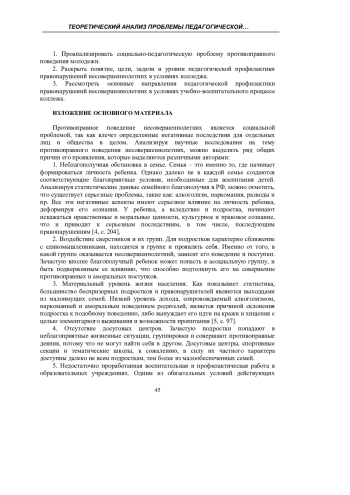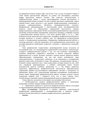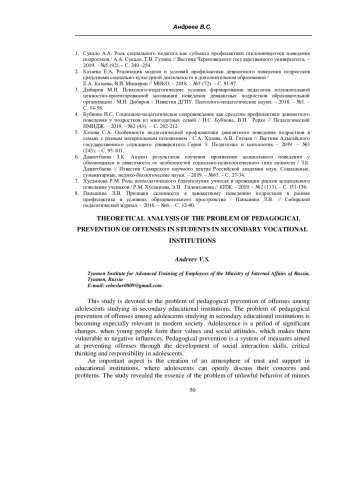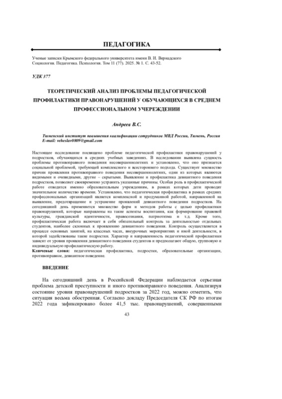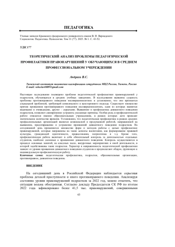 Настоящее исследование посвящено проблеме педагогической профилактики правонарушений у подростков, обучающихся в средних учебных заведениях. В исследовании выявлена сущность проблемы противоправного поведения несовершеннолетних и установлено, что оно признается социальной проблемой, требующей комплексного и всестороннего подхода. Существует множество причин проявления противоправного поведения несовершеннолетних, одни из которых являются видимыми и очевидными, другие - скрытыми. Выявление и профилактика девиантного поведения подростков, позволяет своевременно устранить указанные причины. Особая роль в профилактической работе отводится именно образовательным учреждениям, в рамках которых дети проводят значительное количество времени. Установлено, что педагогическая профилактика в рамках средних профессиональных организаций является комплексной и продуманной работой, направленной на выявление, предотвращение и устранение проявлений девиантного поведения подростков. На сегодняшний день применяется множество форм и методов работы с целью профилактики правонарушений, которые направлены на такие аспекты воспитания, как формирование правовой культуры, гражданской идентичности, правосознания, патриотизма и т. д. Кроме того, профилактическая работа включает в себя обязательный контроль за деятельностью отдельных студентов, наиболее склонных к проявлению девиантного поведения. Контроль осуществляется в процессе основных занятий, на классных часах, внеурочных мероприятиях и иной деятельности, в которой задействованы такие подростки. Характер и направленность педагогической профилактики зависят от уровня проявления девиантного поведения студентов и предполагают общую, групповую и индивидуальную профилактическую работу.
