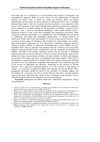 1. Сукало А.А. Роль социального педагога как субъекта профилактики отклоняющегося поведения подростков / А.А. Сукало, Т.В. Гудина // Вестник Череповецкого государственного университета. - 2019. - №5 (92). - С. 240 -254. EDN: JITKBH