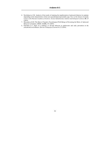 7. Давлетбаева З.К. Анализ результатов изучения проявления асоциального поведения у обучающихся в зависимости от особенностей социально-психологического типа личности / З.К. Давлетбаева // Известия Самарского научного центра Российской академии наук. Социальные, гуманитарные, медико-биологические науки. - 2019. - №65. - С. 27-34. EDN: OZWIYJ