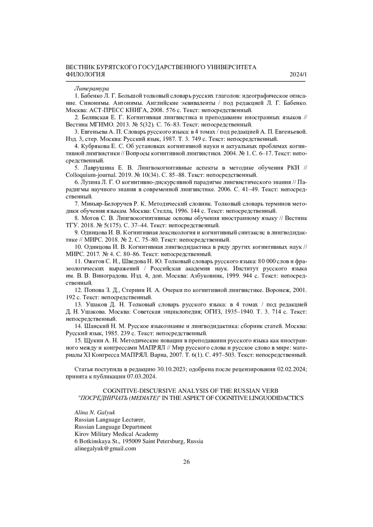 9. Одинцова И. В. Когнитивная лексикология и когнитивный синтаксис в лингводидактике // МИРС. 2018. № 2. С. 75-80. Текст: непосредственный. EDN: XWLMNF