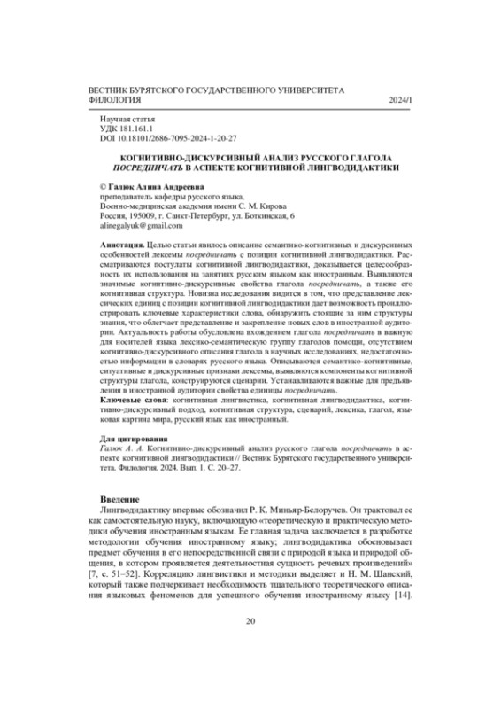 Целью статьи явилось описание семантико-когнитивных и дискурсивных особенностей лексемы посредничать с позиции когнитивной лингводидактики. Рассматриваются постулаты когнитивной лингводидактики, доказывается целесообразность их использования на занятиях русским языком как иностранным. Выявляются значимые когнитивно-дискурсивные свойства глагола посредничать, а также его когнитивная структура. Новизна исследования видится в том, что представление лексических единиц с позиции когнитивной лингводидактики дает возможность проиллюстрировать ключевые характеристики слова, обнаружить стоящие за ним структуры знания, что облегчает представление и закрепление новых слов в иностранной аудитории. Актуальность работы обусловлена вхождением глагола посредничать в важную для носителей языка лексико-семантическую группу глаголов помощи, отсутствием когнитивно-дискурсивного описания глагола в научных исследованиях, недостаточностью информации в словарях русского языка. Описываются семантико-когнитивные, ситуативные и дискурсивные признаки лексемы, выявляются компоненты когнитивной структуры глагола, конструируются сценарии. Устанавливаются важные для предъявления в иностранной аудитории свойства единицы посредничать.