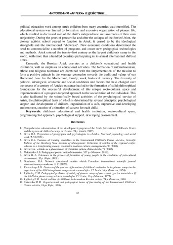 3. Грива О.А. Особенности подготовки специалистов в Международном детском центре “Артек” / О.А. Грива // Научный вестник Оренбургского государственного института менеджмента: Сборник статей регион. конфер. “Россия как трансформирующееся общество: экономика, деловая культура, управление”. - М.: Высш.шк., 2003. - С.90-93. EDN: XWMENF