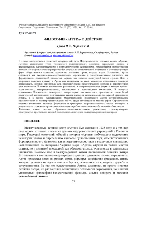 Международный детский центр «Артек» был основан в 1925 году и с тех пор стал одним из самых известных детских оздоровительных учреждений в России и мире. Грядущий столетний юбилей в истории «Артека» побуждает к подведению некоторых итогов и определению наиболее существенных черт, способствовавших формированию его феномена, как в педагогическом, так и в культурном контекстах.