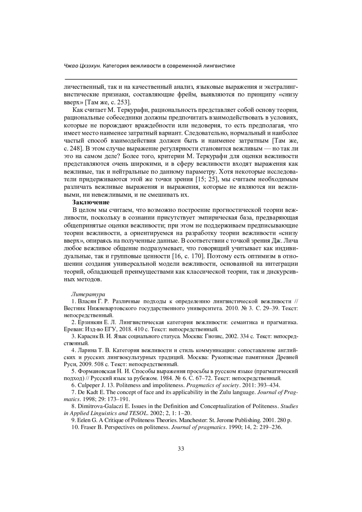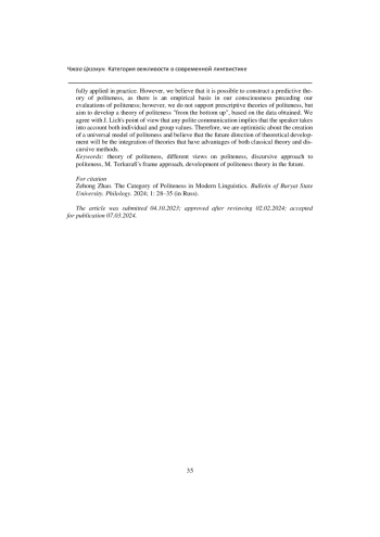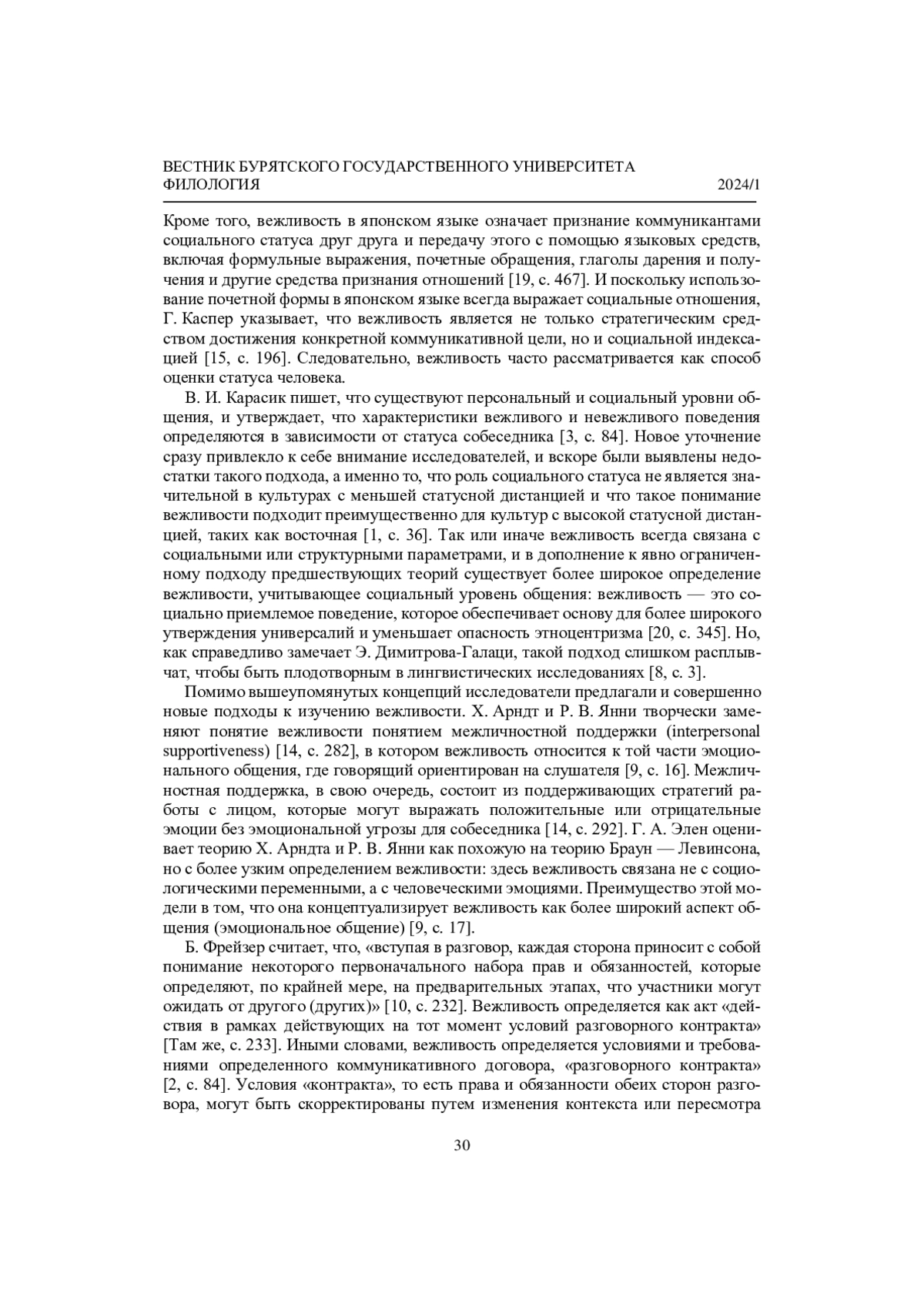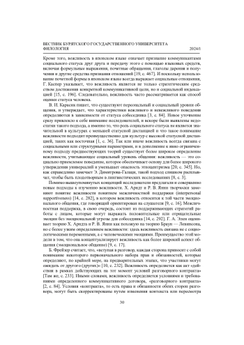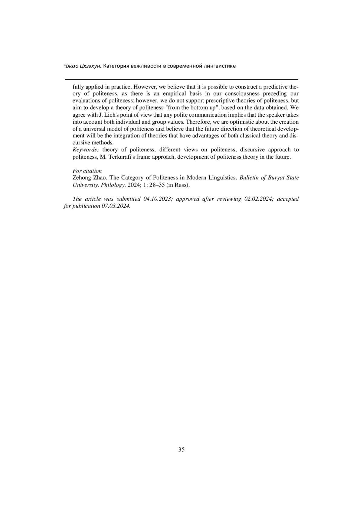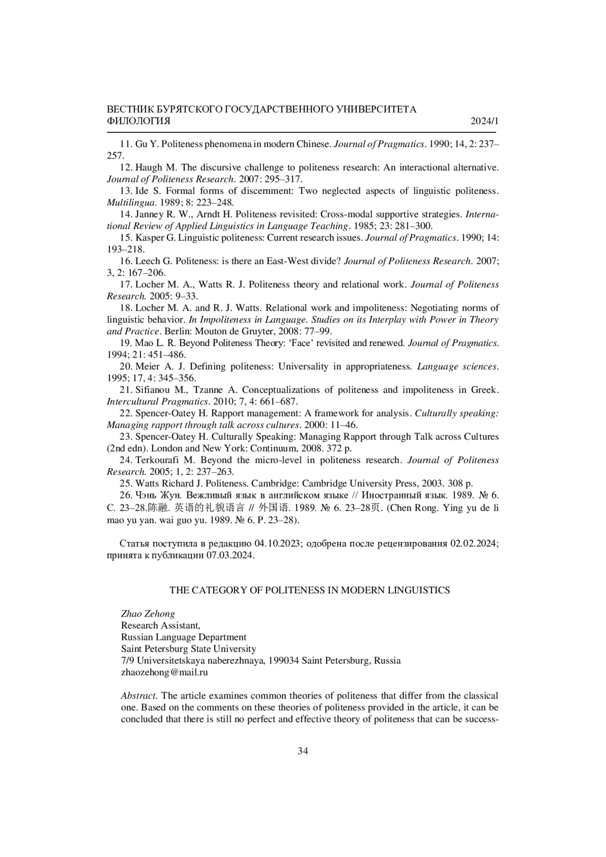 ЧЖАО Ц. КАТЕГОРИЯ ВЕЖЛИВОСТИ В СОВРЕМЕННОЙ ЛИНГВИСТИКЕ // ВЕСТНИК БУРЯТСКОГО ГОСУДАРСТВЕННОГО УНИВЕРСИТЕТА. ФИЛОЛОГИЯ. 2024. № 1