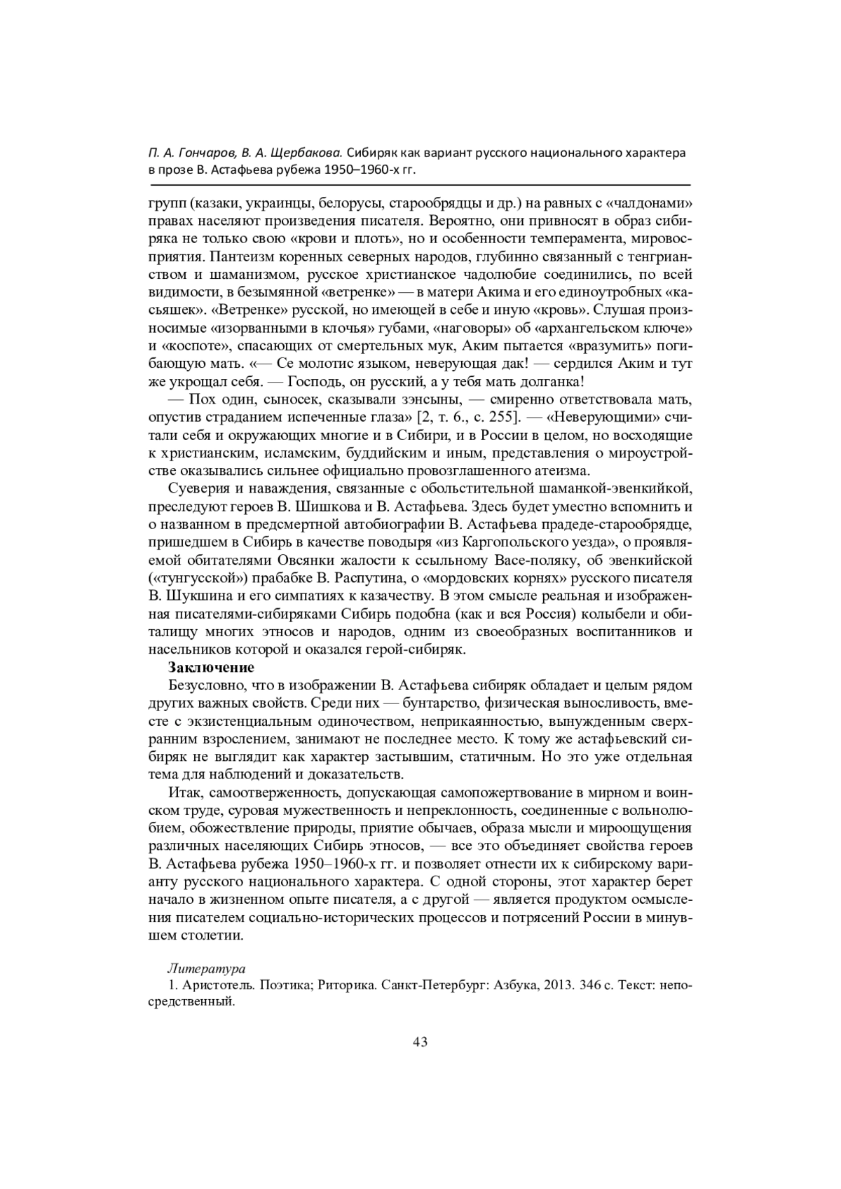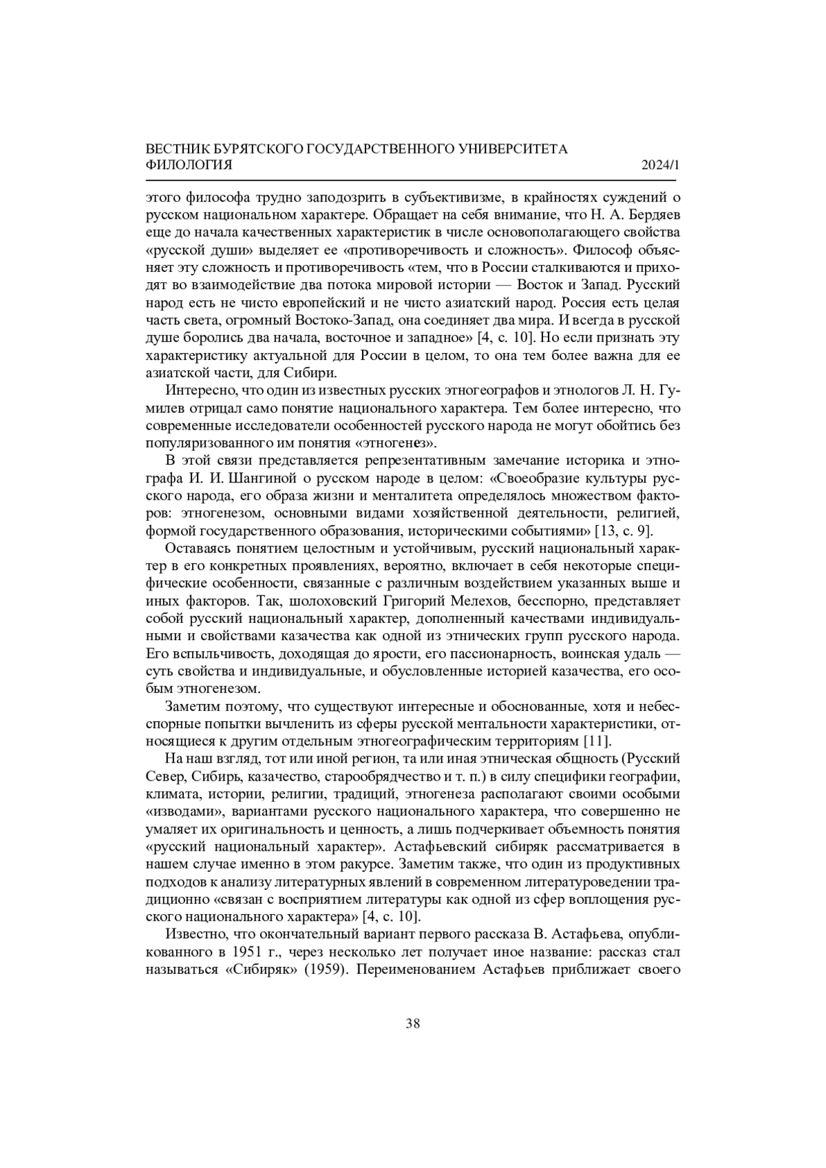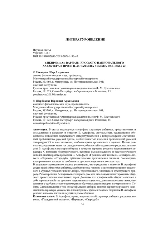 В статье исследуется специфика характера сибиряка, представленная и осмысленная в рассказах и повестях В. Астафьева. Актуальность исследования обусловлена вниманием современного литературоведения к историософской составляющей проблематике русской прозы, необходимостью изучения произведений русской литературы ХХ в. в ее эволюции, наиболее ярких проявлениях и оценках. Целью данного исследования является определение особенностей созданного в рассказах и повестях В. Астафьева характера сибиряка в качестве варианта русского национального характера. С помощью биографического, историко-функционального и текстологического методов анализируются рассказы В. Астафьева «Гражданский человек», «Сибиряк», повести «Перевал», «Стародуб», публицистические произведения писателя. Рассматриваются различные взгляды на особенности русского национального характера. В результате проведенного анализа установлено, что в рассказах и повестях В. Астафьева создан яркий образ героя-сибиряка, храброго воина, готового к самопожертвованию, закаленного в суровых условиях жизни Сибири, трудолюбивого, знающего и чувствующего природу. Редактирование Астафьевым его первого рассказа шло по пути акцентирования сибирского происхождения его главного героя. Доказано, что астафьевский сибиряк заключает в себе коренные свойства русского национального характера, дополненные качествами, связанными с особыми этногеографическими обстоятельствами истории и современности Сибири. Сделаны выводы о том, что астафьевский сибиряк является вариантом русского национального характера, указано, что в последующем зрелом и позднем творчестве В. Астафьева усилено внимание писателя к судьбе героев-сибиряков.