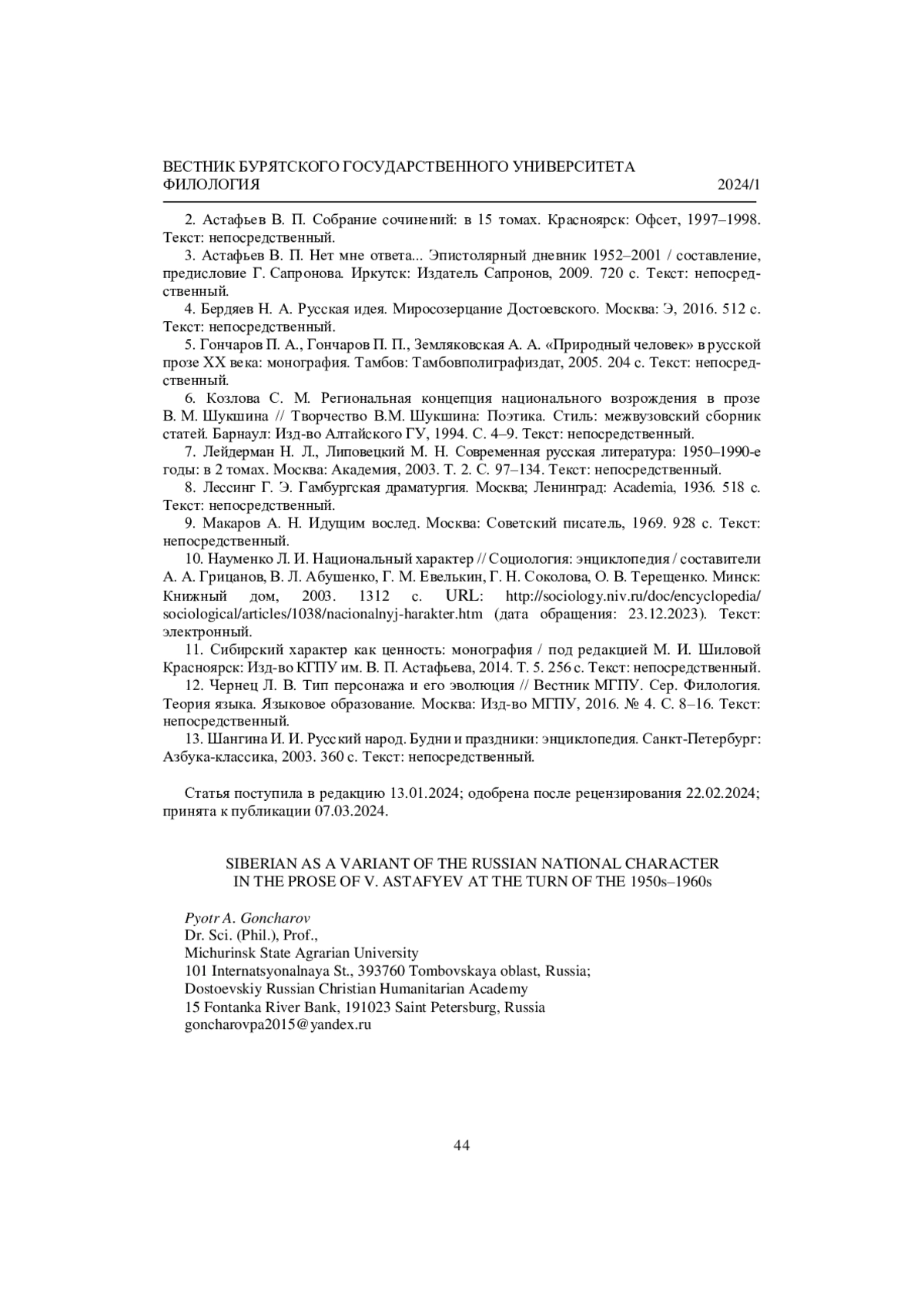5. Гончаров П. А., Гончаров П. П., Земляковская А. А. “Природный человек” в русской прозе XX века: монография. Тамбов: Тамбовполиграфиздат, 2005. 204 с. Текст: непосредственный. EDN: QRVXQV