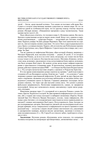 В статье впервые анализируется второй и последний роман Андрея Игумнова (1959-2021) «Кукушкины дети», необычный для литературы Бурятии, созданный в постмодернистской технике. Анализируется концепция человека, в которой наблюдаем контроверзу двух антиномичных начал - постоянное тяготение к идее сверхчеловека с его высокомерием и приниженность от пребывания в будничности, обыкновенности с ее комплексами. Определена основная проблема жизни героя - проблема идентификации сугубо индивидуальной, личностной, и проблема идентификации в условной семье Матушки и ее деток - «кукушкиных детей», рожденных от разных отцов и оставленных ею на попечение отцов. Отмечено своеобразие связи между этими проявлениями - как бы проступание друг в друге, отсутствие полноты автономного существования, несепарированность. Оба начала стремятся к своему пределу, коррелируют как с особенностями хронотопа, так и с сюжетно-композиционным построением