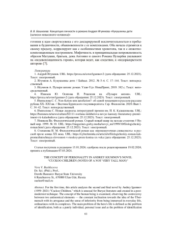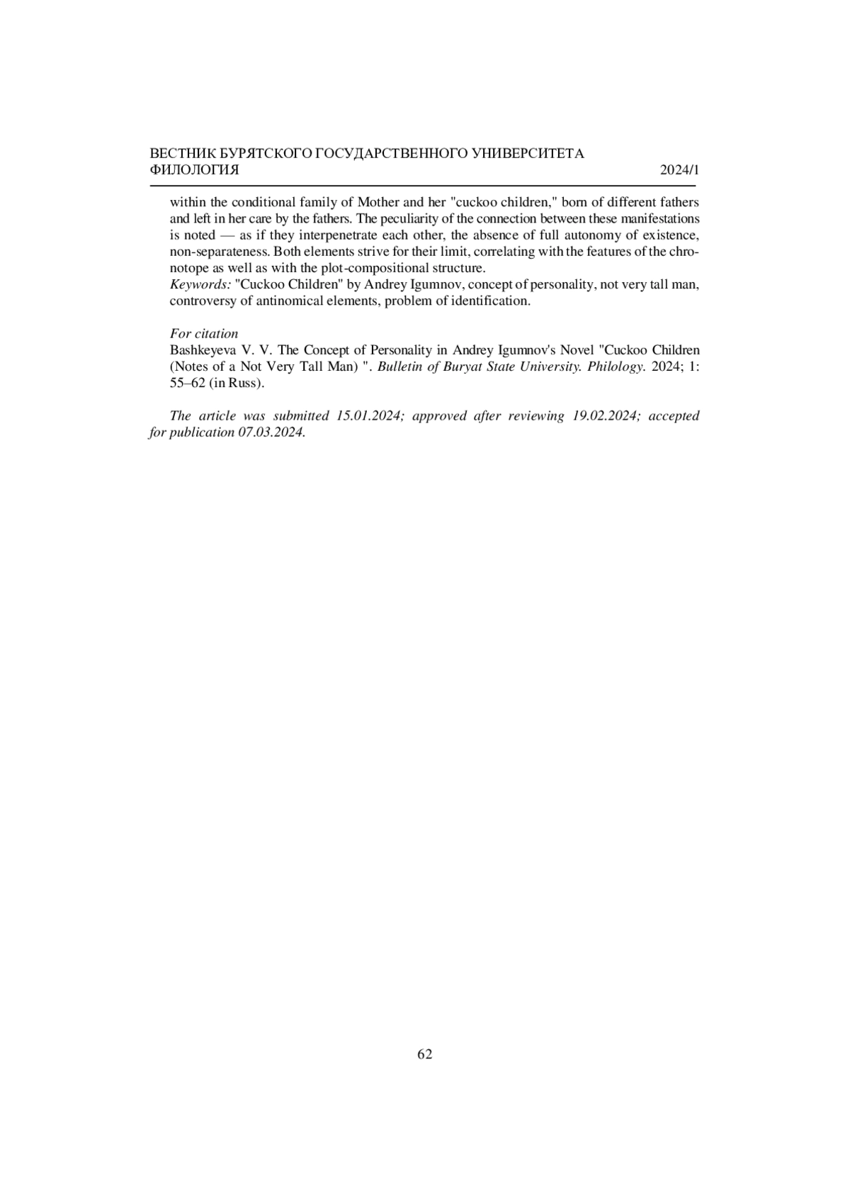 БАШКЕЕВА В. В. КОНЦЕПЦИЯ ЛИЧНОСТИ В РОМАНЕ АНДРЕЯ ИГУМНОВА "КУКУШКИНЫ ДЕТИ (ЗАПИСКИ НЕВЫСОКОГО ЧЕЛОВЕКА)" // ВЕСТНИК БУРЯТСКОГО ГОСУДАРСТВЕННОГО УНИВЕРСИТЕТА. ФИЛОЛОГИЯ. 2024. № 1