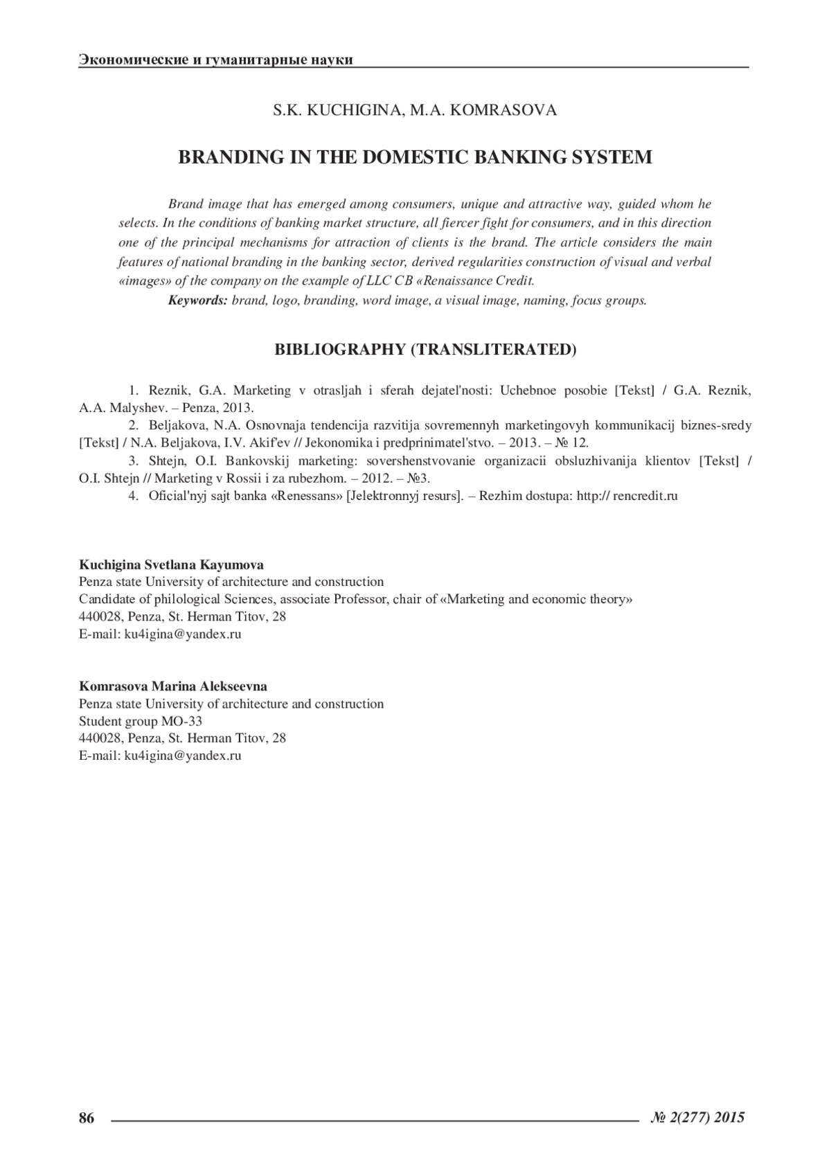 Бренд – это образ, который сложился у потребителя, уникальный и привлекательный символ, руководствуясь которым он осуществляет свой выбор. В условиях рынка банковские структуры все ожесточеннее ведут борьбу за потребителей, и в этом направлении одним из главных механизмов для привлечения клиентов является бренд. В статье рассмотрены основные особенности отечественного брендинга в банковской сфере, выведены закономерности конструирования визуального и словесного «образов» компании на примере ООО КБ «Ренессанс Кредит»