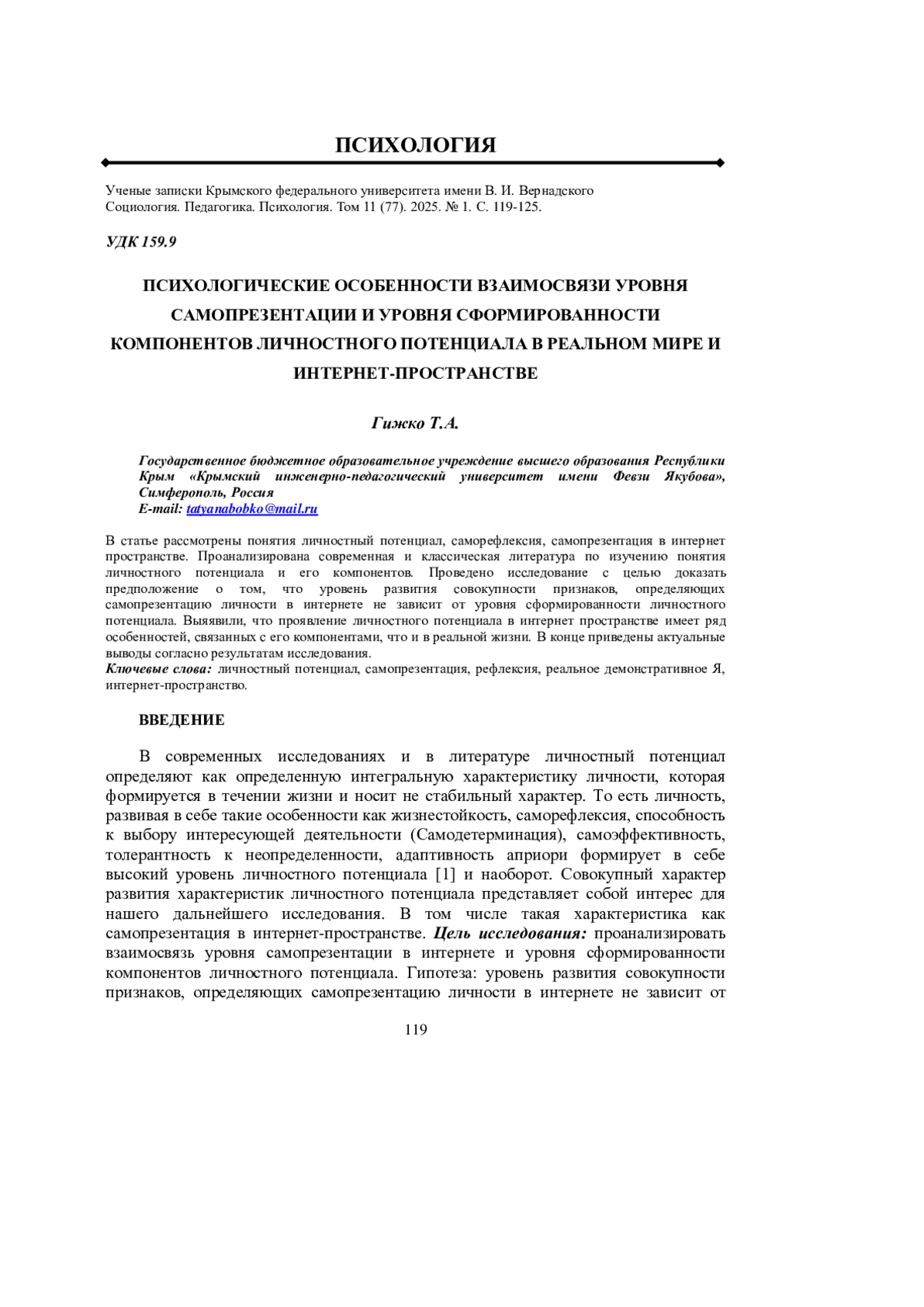 В статье рассмотрены понятия личностный потенциал, саморефлексия, самопрезентация в интернет пространстве. Проанализирована современная и классическая литература по изучению понятия личностного потенциала и его компонентов. Проведено исследование с целью доказать предположение о том, что уровень развития совокупности признаков, определяющих самопрезентацию личности в интернете не зависит от уровня сформированности личностного потенциала. Выявили, что проявление личностного потенциала в интернет пространстве имеет ряд особенностей, связанных с его компонентами, что и в реальной жизни. В конце приведены актуальные выводы согласно результатам исследования.