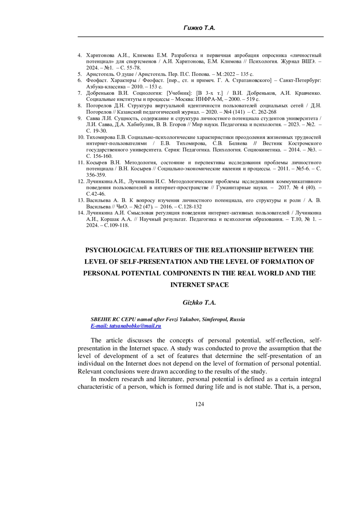 14. Лучинкина А.И. Смысловая регуляция поведения интернет-активных пользователей / Лучинкина А.И., Коршак А.А. // Научный результат. Педагогика и психология образования. - Т.10, № 1. - 2024. - С.109-118. EDN: NNTLOU