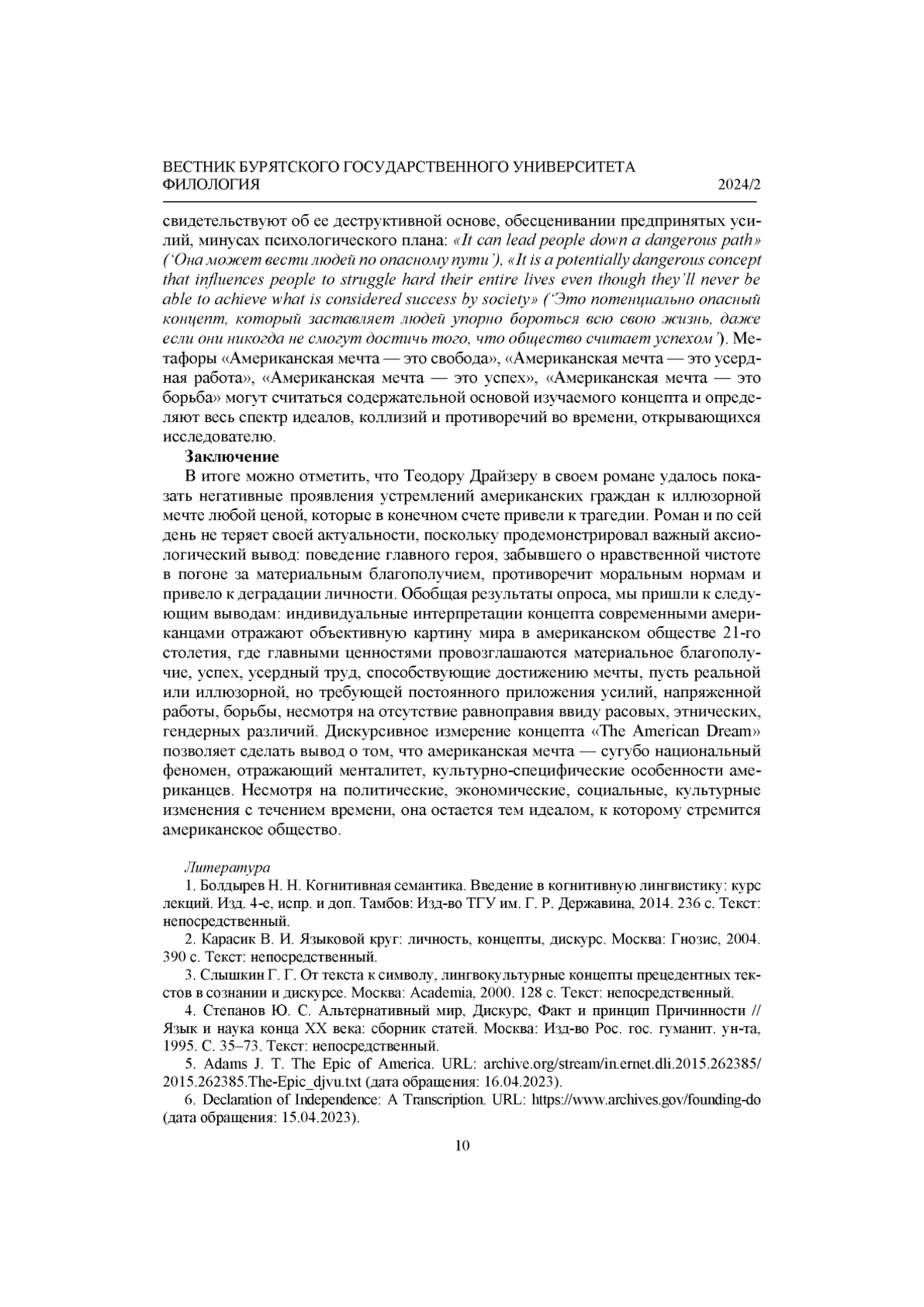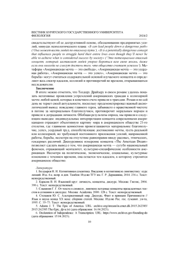 Статья представляет собой опыт дискурсивной интерпретации концепта «The American dream» на материале романа выдающегося писателя Теодора Драйзера «An American tragedy», в котором отражена иллюзорность мечтаний в поисках лучшей жизни в американском обществе первой половины XX века, а также представлений современных американцев. Основная цель работы - понять специфику объективации этого концепта. Актуальный характер исследования определяется значимостью достижения жизненных целей и успеха в современном прагматичном обществе. Основной интерпретативный метод на основе дискурсивного анализа, а также диагностический метод (опрос) используются для анализа концепта. Авторы описывают данный концепт в единстве его понятийной, образной и ценностной составляющих, анализируют его содержательное наполнение в романе, а также в текстах персонального дискурса на основе опроса американских граждан. В работе обращается внимание на неоднозначность трактовок современными американцами этого концепта ввиду объективных реалий меняющегося мира. Авторы приходят к выводу о том, что рассматриваемый концепт - сугубо национальный феномен, отражающий менталитет, культурно-специфические особенности американцев.