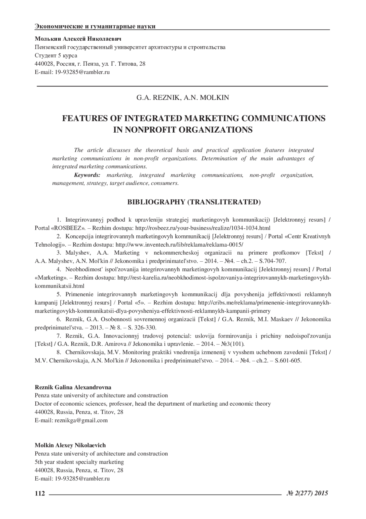 3. алышев, А.А. Маркетинг в некоммерческой организации на примере профкомов [Текст] / А.А. Малышев, А.Н. Молькин // Экономика и предпринимательство. - 2014. - №4. - ч.2. - С. 704-707. EDN: SZABOB