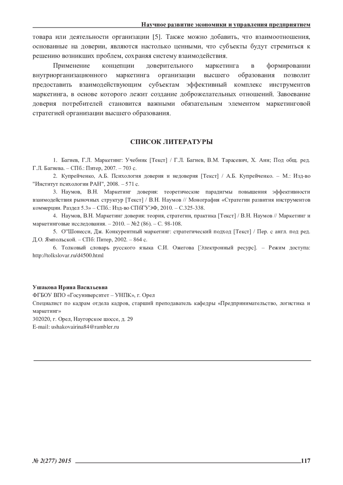 4. Наумов, В.Н. Маркетинг доверия: теория, стратегии, практика /В.Н. Наумов//Маркетинг и маркетинговые исследования. -2010. -№2 (86). -С. 98-108. EDN: LKDUHX