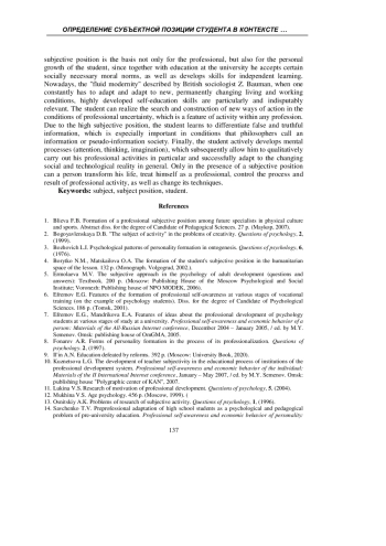 Автор подходит к категории субъектной позиции как к конструкции, которая характеризуется интегративным значением. В статье предпринимается попытка рассмотреть субъектную позицию в максимально широком ракурсе, дать ей исчерпывающие характеристики. На основе различных исследовательских взглядов выделяются следующие характеристики субъектной позиции: осознанность, самостоятельность, творчество, ответственность, профессиональная идентичность. Делается вывод о том, что высокая субъектная позиция лежит в основе успешности образования как такового. Следовательно, благодаря ей происходят: формирование профессиональной культуры, развитие психических процессов, адаптация к трудовой среде и т. д.