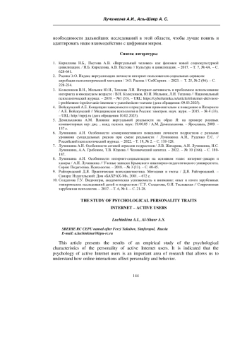 В данной статье представлены результаты эмпирического исследования психологических особенностей личности интернет-активных пользователей. Указано, что психология интернет-активных пользователей являет собой важную область исследований, которая позволяет понять, как онлайн-взаимодействия влияют на личность и поведение. Приведен итог диагностики психологических характеристик чрезмерно активных пользователей интернета: предположение о замкнутости, интровертированности, наличии трудностей в коммуникации не подтверждено. Напротив, выяснилось, что отличительными чертами интернет-активных пользователей являются: общительность, независимость, контактность, добродушие, открытость, социальная смелость, импульсивность, социабельность, стремление к социальному одобрению, конформизм, неадекватная самооценка.