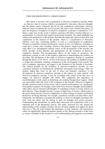 15. Улыбина П. В. Обсессивно-компульсивное расстройство - заболевание современности? / П. В. Улыбина, В. И. Корнева, Н. С. Сединина // Инновационные исследования: проблемы внедрения результатов и тенденции развития. - 2023. - С. 36-42.