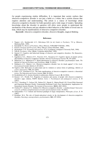 7. Сагалакова О. А. Когнитивные факторы нарушений психической деятельности при обсессивно-компульсивном расстройстве / О. А. Сагалакова, О. В. Жирнова, Д. В. Труевцев [и др.] // Сибирский психологический журнал. - 2020. - № 75. - С. 159-180. EDN: NRMJMH