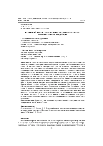 В статье изложен анализ современного положения бурятского языка: языковая ситуация на территории этнической Бурятии, текущие тенденции в отношении к языку, его представленность в интернет-пространстве. Языковая ситуация в рассматриваемом ареале в настоящее время характеризуется языковым сдвигом с бурятского языка на русский и переходом с бурятско-русского двуязычия к русскому одноязычию. В противовес этому наблюдается положительное отношение к бурятскому языку, что однако не всегда выливается в конкретные действия по его передаче. В этих условиях активизируется деятельность по поддержке языка, нередко это проявляется в «низовых», любительских инициативах в интернет-пространстве. Анализ функционирования бурятского языка в интернете позволил обнаружить, что у части сообщества есть запрос на бурятоязычную интернет-коммуникацию и изучение бурятского языка. Всего бурятоязычный сегмент интернета представлен контентом трех форматов: 1) собственно контент на бурятском языке; 2) продукты, привлекающие к проблеме утраты языка; 3) ресурсы, специализирующиеся на обучении языку. Актуальность этого контента и спрос на него у определенной аудитории, а также его воспроизводство и расширение с течением времени позволяют говорить о его гибридности и многозадачности такого контента. В статье делается вывод о ревитализационном потенциале интернет-опосредованных инициатив как одного из направлений ревитализации бурятского языка.