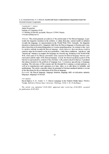 4. Иванов В. В., Харитонов В. С. Бурятский язык // Итоговые документы Научного центра по сохранению, возрождению и документации языков России / ИЯ РАН. 2021. С. 137-142. URL: https://iling-ran.ru/languages_of_russia/2021_stage1/doc2.pdf (дата обращения: 31.01.2024). Текст: электронный.