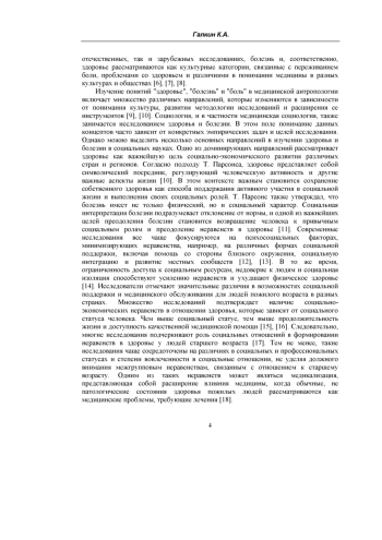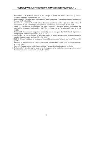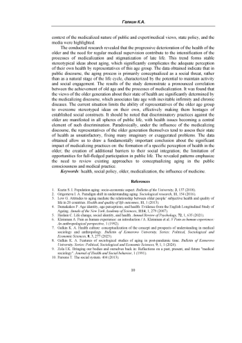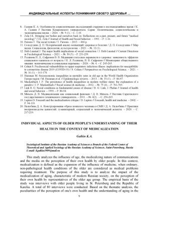 В настоящем исследовании анализируется влияние возраста, медикализирующего характера коммуникаций и средств массовой информации на восприятие собственного здоровья пожилыми людьми. Медикализация в этом контексте определяется как расширение влияния медицины, когда обычные, не патологические состояния здоровья пожилых людей рассматриваются как медицинские проблемы, требующие лечения. Целью настоящего исследования является анализ влияния медикализации старения, характерной для современного российского общества, на восприятие состояния собственного здоровья представителями старшей возрастной группы. Эмпирической базой исследования стали интервью с людьми старшего возраста, проживающими в Санкт-Петербурге и Республике Карелия. Всего проведено 80 интервью. На основе тематического анализа были выделены особенности восприятия собственного здоровья и осмысления старения в контексте медикализированного характера общественных и экспертных/медицинских взглядов, политики государства, СМИ.