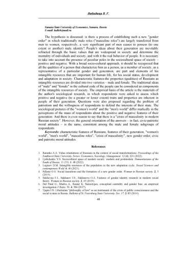 9. Латинов Г.И., Беликова М.В. Самоощущение и социальное самочувствие мужчин в современных российском и китайском обществах: трансформация стандартов маскулинности / Г.И. Латинов, М.В. Беликова // Женщина в российском обществе. - 2022. - Специальный выпуск. - С.27-41. EDN: QVGXKP
