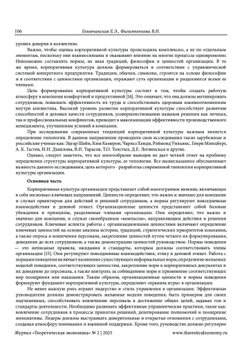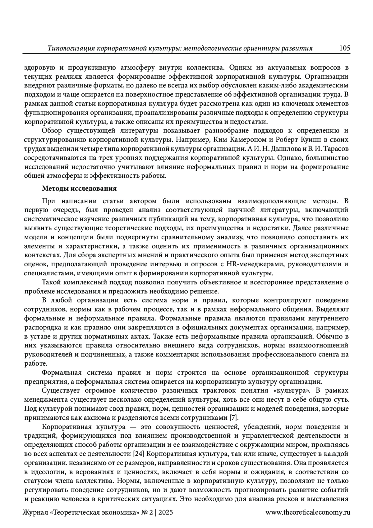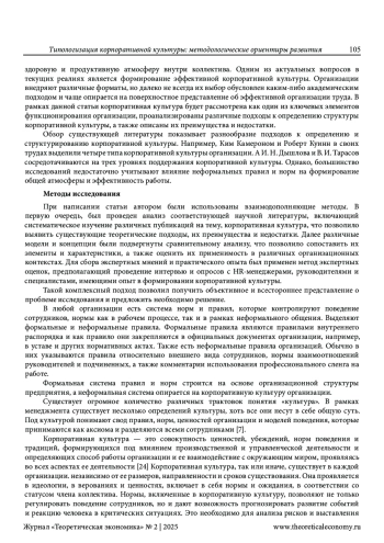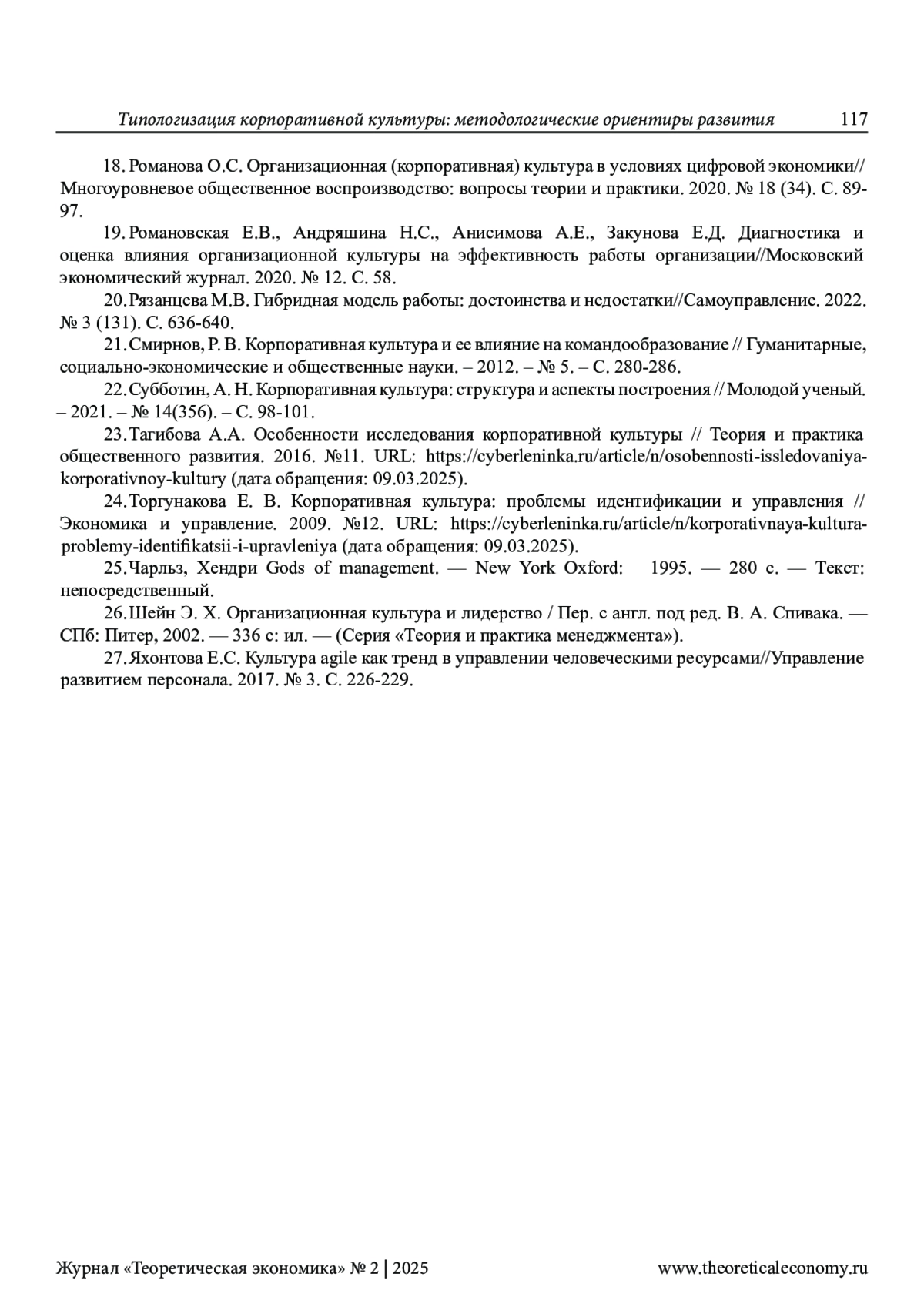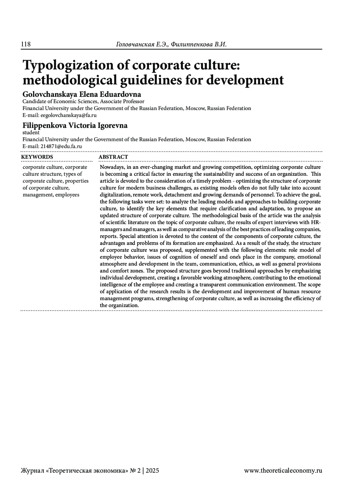 ФИЛИППЕНКОВ А. В., ГОЛОВЧАНСКАЯ Е. Э. ТИПОЛОГИЗАЦИЯ КОРПОРАТИВНОЙ КУЛЬТУРЫ: МЕТОДОЛОГИЧЕСКИЕ ОРИЕНТИРЫ РАЗВИТИЯ // ТЕОРЕТИЧЕСКАЯ ЭКОНОМИКА. 2025. № 2 (122)