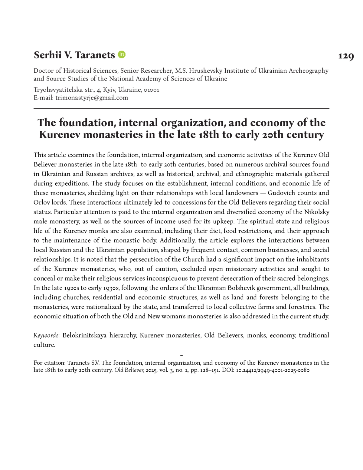 В статье на основании многочисленных архивных источников, выявленных в украинских и российских архивах, а также полученного в ходе полевых исследований историко-археографического и этнографического материала, исследуются вопросы, аффилированные с основанием, внутренним состоянием и хозяйственной деятельностью Куренёвских старообрядческих монастырей в конце ХVIII — начале ХХ вв. Отдельное внимание обращено на взаимоотношения старообрядцев с. Куренёвки с местными помещиками, графами Гудовичами и князьями Орловыми, закончившиеся уступками староверам в определении их социального статуса. Исследуется внутренне устройство и многопрофильное хозяйство Никольского мужского монастыря, а также средства, получаемые на его содержание, духовное состояние и религиозность куренёвских иноков, их питание и пищевые запреты, способы содержания монашеского тела, взаимоотношения местных русских с украинским населением, посредством частых контактов, в результате поддержания разнообразных деловых и житейских отношений. Отмечается, что преследования господствующей Церкви наложили особый отпечаток на насельников Куренёвских монастырей, которые из личной практики исключили открытую миссионерскую деятельность, пытаясь скрыть или сделать незамеченным свое богослужение из-за опасения осквернить принадлежавшую им святыню. В конце 1920-х — начале 1930-х гг. по распоряжению украинского большевистского правительства все принадлежащие монастырям храмы, жилые и хозяйственные здания, земля и лес были национализированы в пользу государства, местного колхоза и лесничества. Изучается хозяйственное положение староженского и новоженского монастырей.