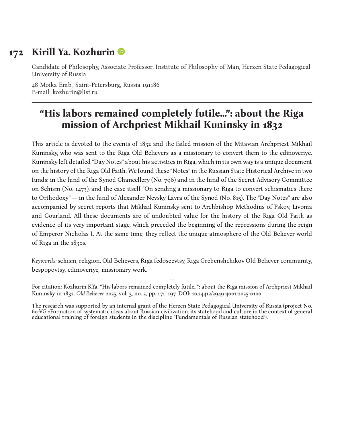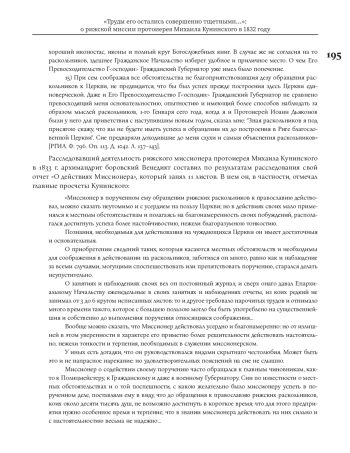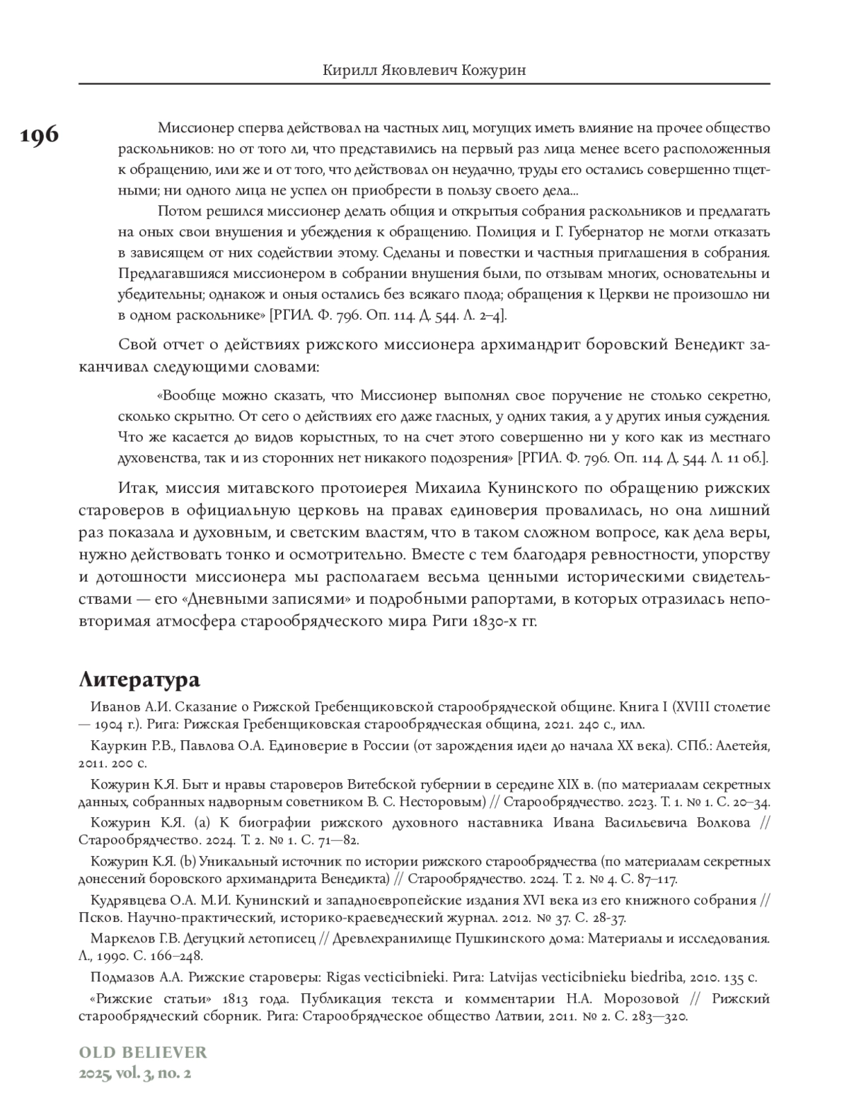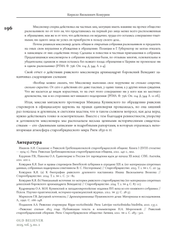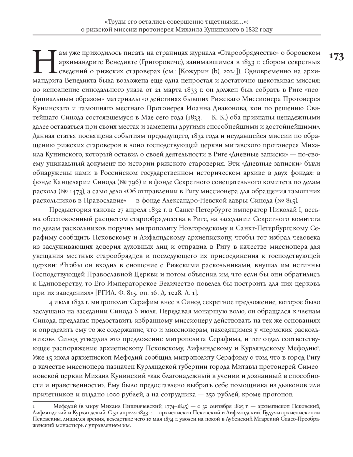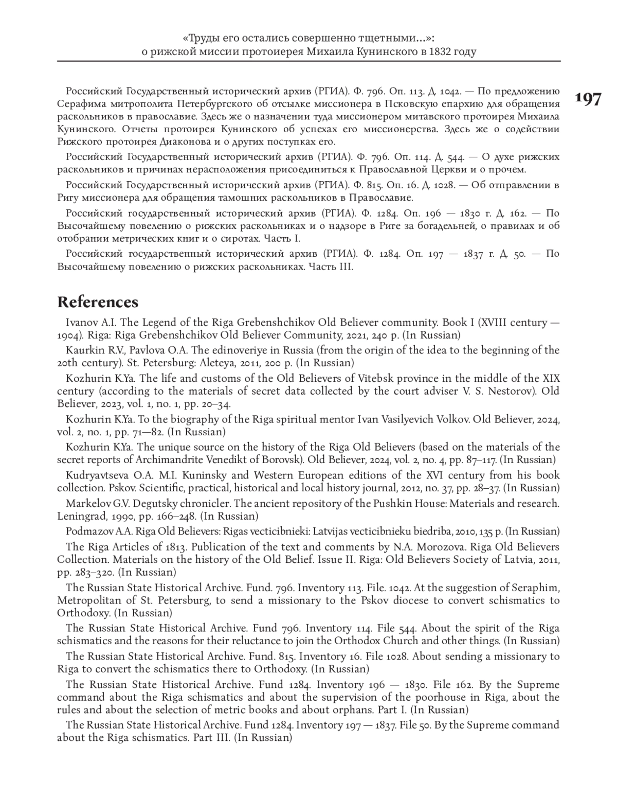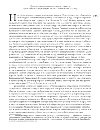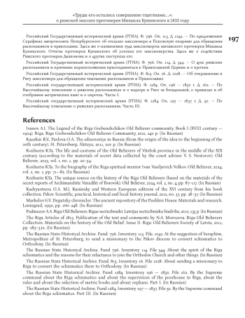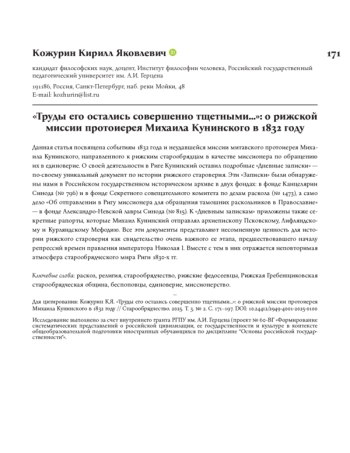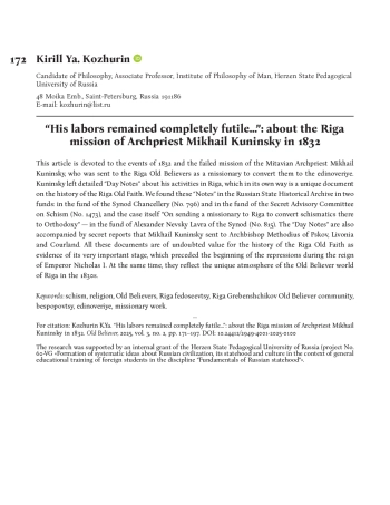 Данная статья посвящена событиям 1832 года и неудавшейся миссии митавского протоиерея Михаила Кунинского, направленного к рижским старообрядцам в качестве миссионера по обращению их в единоверие. О своей деятельности в Риге Кунинский оставил подробные «Дневные записки» — по-своему уникальный документ по истории рижского староверия. Эти «Записки» были обнаружены нами в Российском государственном историческом архиве в двух фондах: в фонде Канцелярии Синода (№ 796) и в фонде Секретного совещательного комитета по делам раскола (№ 1473), а само дело «Об отправлении в Ригу миссионера для обращения тамошних раскольников в Православие» — в фонде Александро-Невской лавры Синода (№ 815). К «Дневным запискам» приложены также секретные рапорты, которые Михаил Кунинский отправлял архиепископу Псковскому, Лифляндскому и Курляндскому Мефодию. Все эти документы представляют несомненную ценность для истории рижского староверия как свидетельство очень важного ее этапа, предшествовавшего началу репрессий времен правления императора Николая I. Вместе с тем в них отражается неповторимая атмосфера старообрядческого мира Риги 1830-х гг.