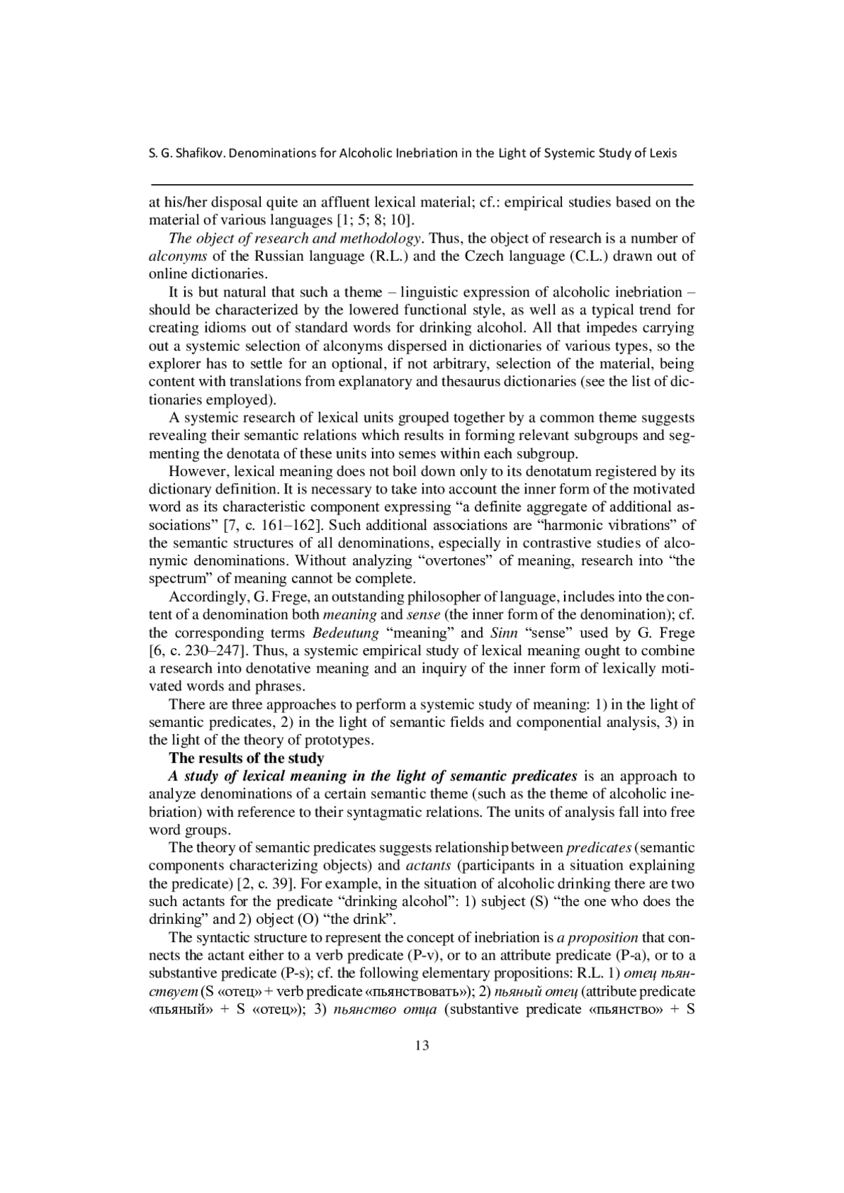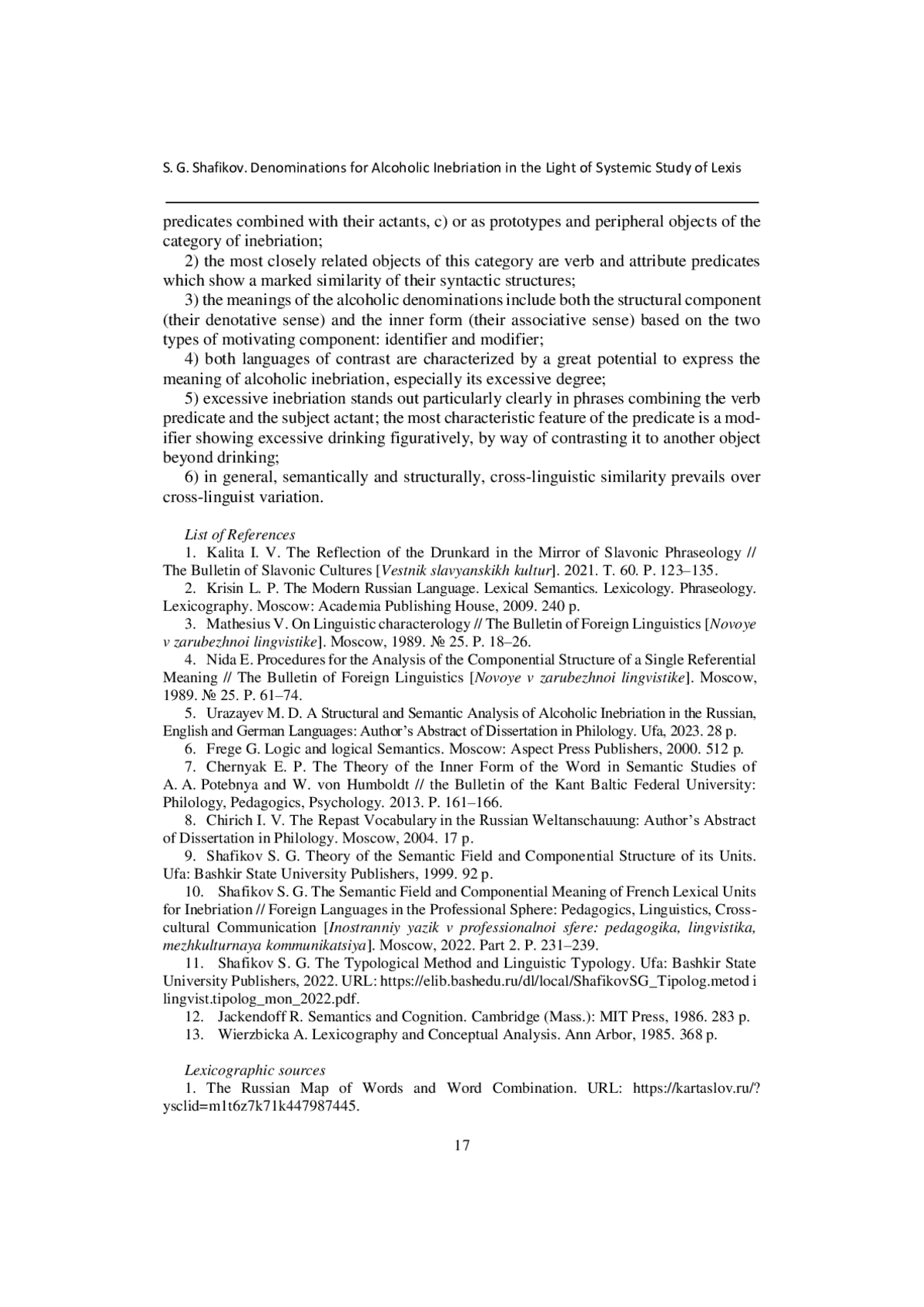 10. Shafikov S. G. The Semantic Field and Componential Meaning of French Lexical Units for Inebriation // Foreign Languages in the Professional Sphere: Pedagogics, Linguistics, Crosscultural Communication [Inostranniy yazik v professionalnoi sfere: pedagogika, lingvistika, mezhkulturnaya kommunikatsiya]. Moscow, 2022. Part 2. P. 231-239.