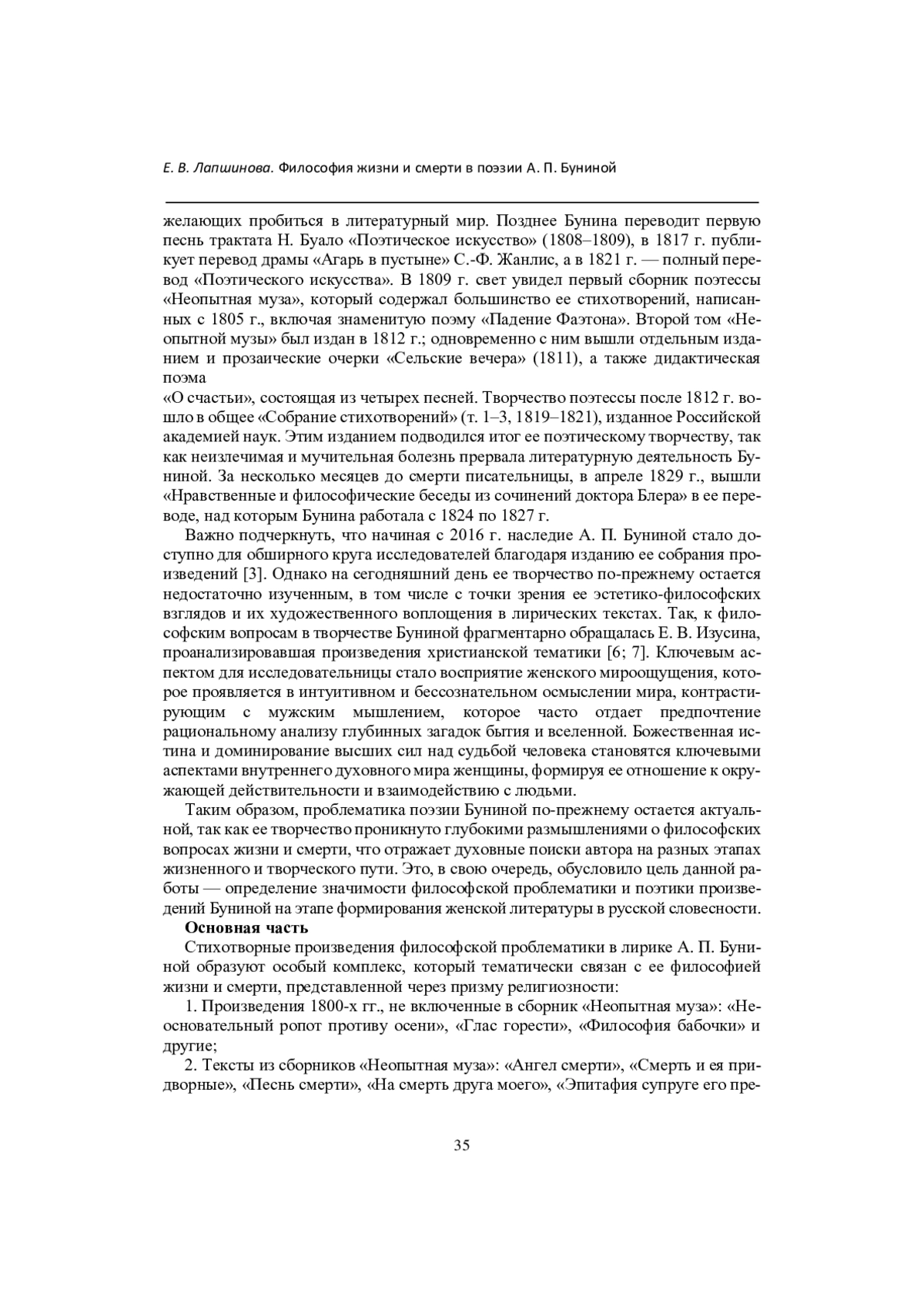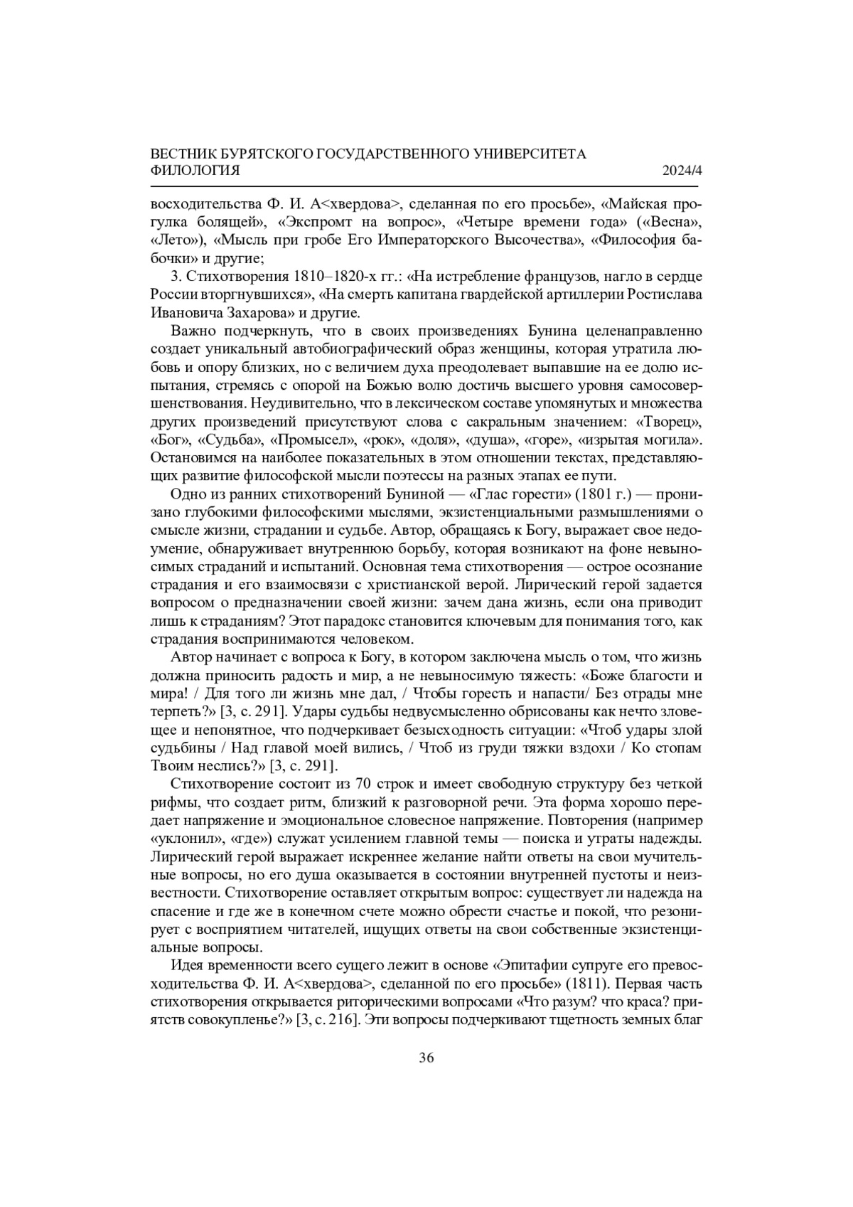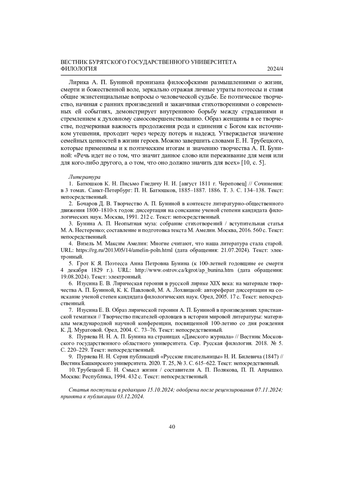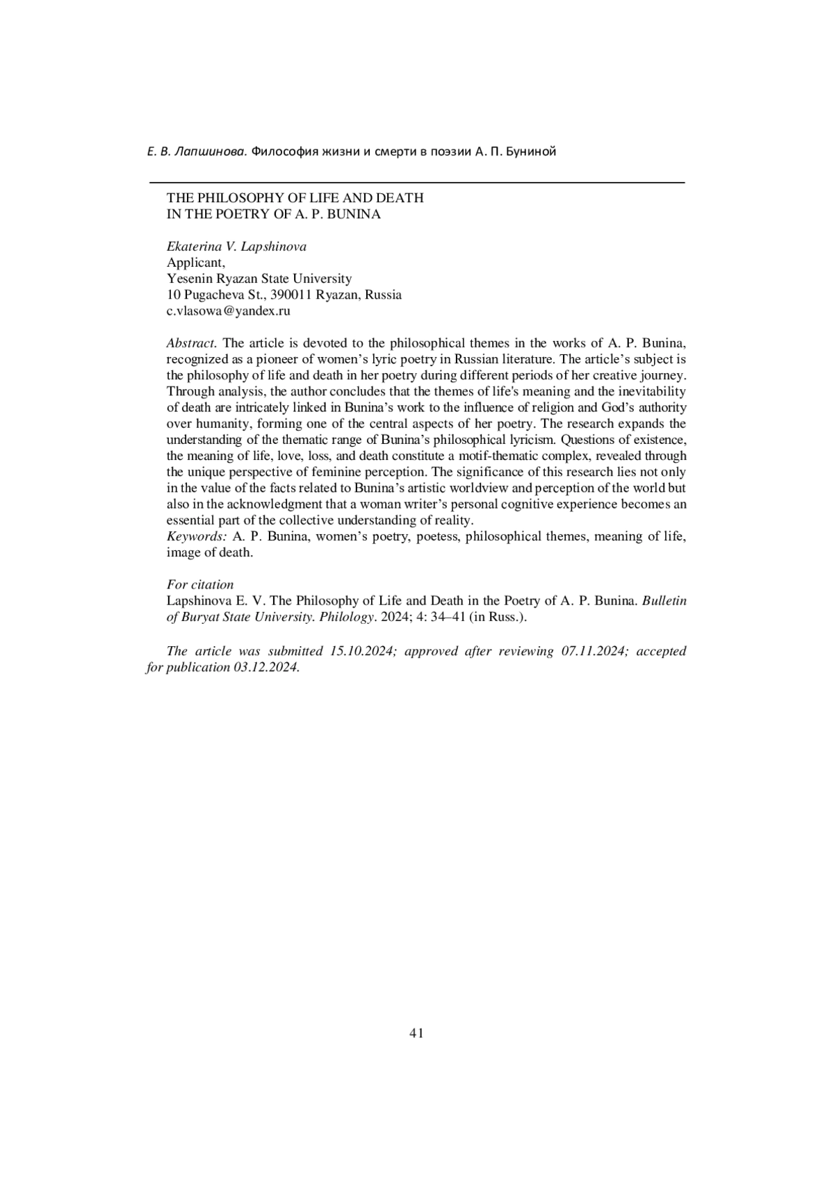 ЛАПШИНОВА Е. В. ФИЛОСОФИЯ ЖИЗНИ И СМЕРТИ В ПОЭЗИИ А. П. БУНИНОЙ // ВЕСТНИК БУРЯТСКОГО ГОСУДАРСТВЕННОГО УНИВЕРСИТЕТА. ФИЛОЛОГИЯ. 2024. № 4