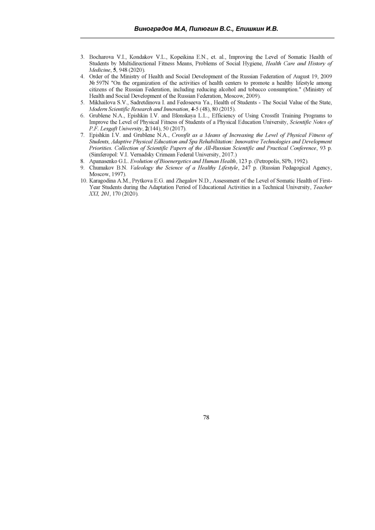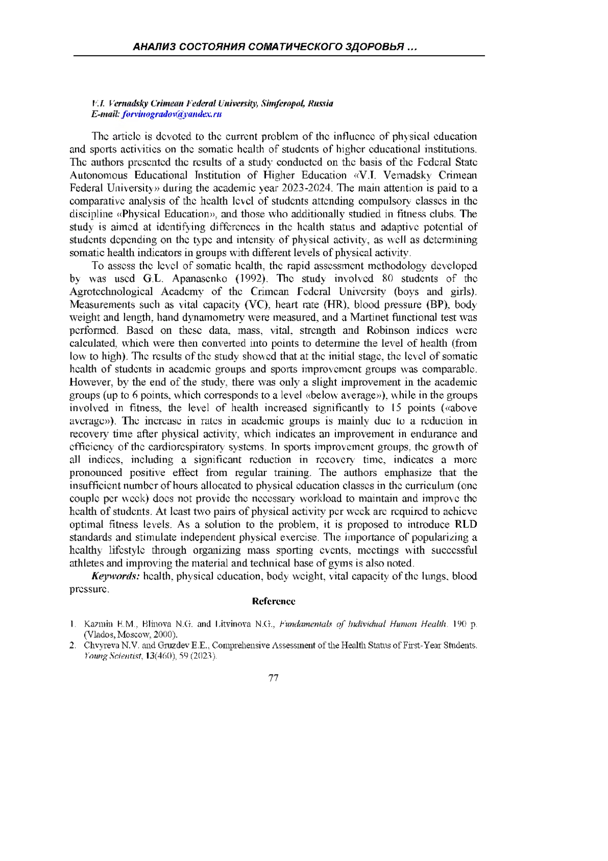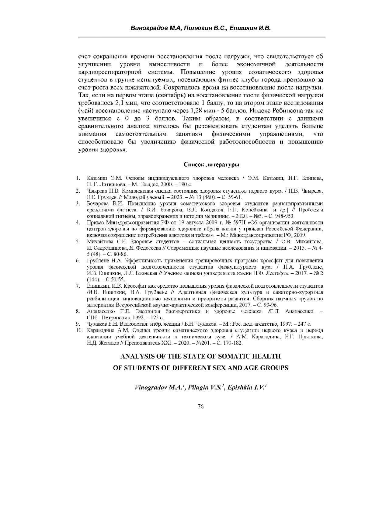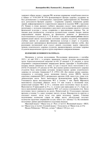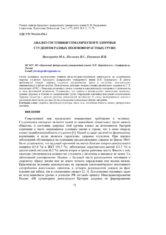 ВИНОГРАДОВ М. А., ПИЛЮГИН В. С., ЕПИШКИН И. В. АНАЛИЗ СОСТОЯНИЯ СОМАТИЧЕСКОГО ЗДОРОВЬЯ СТУДЕНТОВ РАЗНЫХ ПОЛОВОВОЗРАСТНЫХ ГРУПП // УЧЕНЫЕ ЗАПИСКИ КРЫМСКОГО ФЕДЕРАЛЬНОГО УНИВЕРСИТЕТА ИМЕНИ В. И. ВЕРНАДСКОГО. СОЦИОЛОГИЯ. ПЕДАГОГИКА. ПСИХОЛОГИЯ. 2025. ТОМ 11 (77). № 2