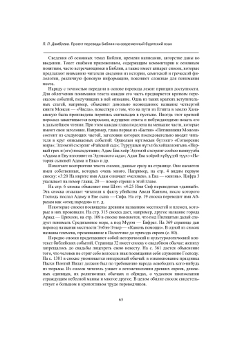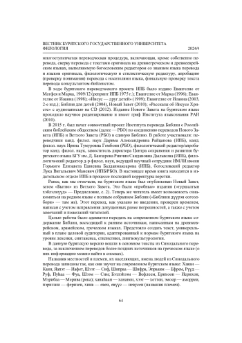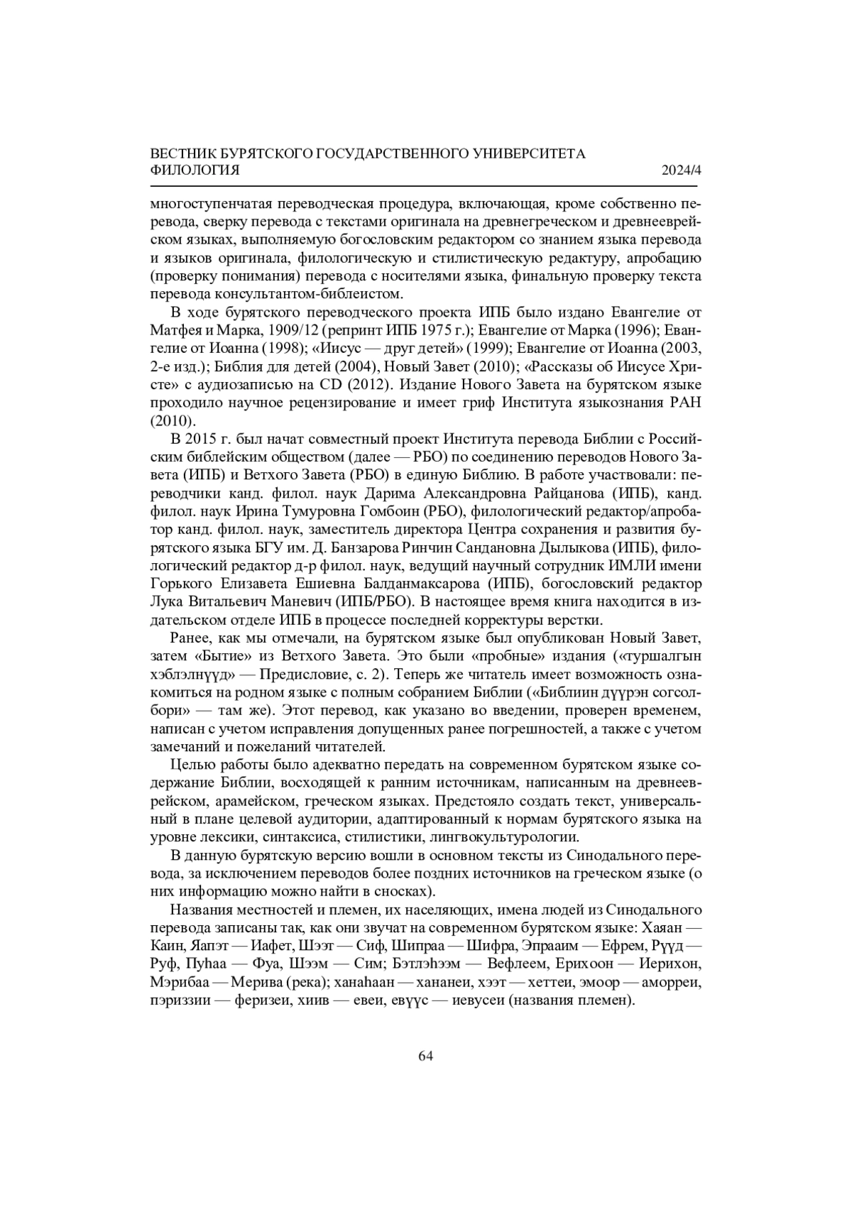 Рецензия посвящена большому проекту Института перевода Библии (далее — ИПБ) на бурятский язык, который был начат в 1975 г. с факсимильного репринта перевода евангелий от Матфея и Марка (1909), выполненных усилиями Иркутского комитета Православного миссионерского общества.