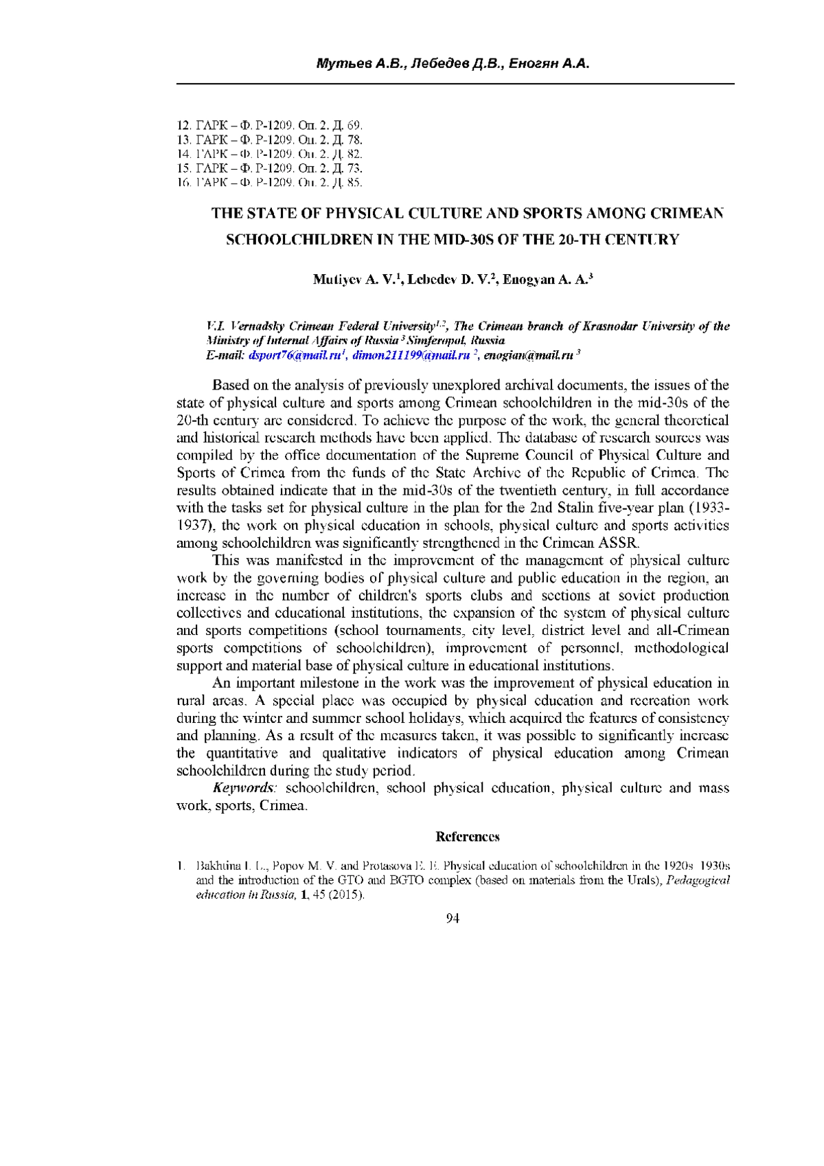 МУТЬЕВ А. В., ЛЕБЕДЕВ Д. В., ЕНОГЯН А. А. СОСТОЯНИЕ ФИЗИЧЕСКОЙ КУЛЬТУРЫ И СПОРТА СРЕДИ КРЫМСКИХ ШКОЛЬНИКОВ В СЕРЕДИНЕ 30-Х ГОДОВ ХХ ВЕКА // УЧЕНЫЕ ЗАПИСКИ КРЫМСКОГО ФЕДЕРАЛЬНОГО УНИВЕРСИТЕТА ИМЕНИ В. И. ВЕРНАДСКОГО. СОЦИОЛОГИЯ. ПЕДАГОГИКА. ПСИХОЛОГИЯ. 2025. ТОМ 11 (77). № 2