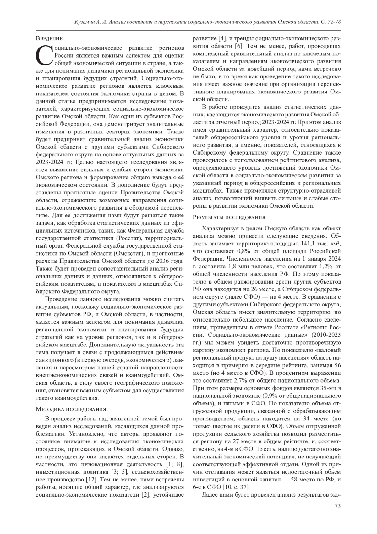 Статья посвящена анализу состояния и перспектив социально-экономического развития Омской области, одного из субъектов Российской Федерации. Исследование актуально в контексте оценки региональной экономики и планирования будущих стратегий, особенно на фоне экономического давления и пересмотра внешнеэкономических связей. Целью работы является выявление сильных и слабых сторон экономики региона и формирование прогнозных оценок на основе данных за 2023-2024 гг. Для достижения цели решаются задачи по обработке статистических данных из официальных источников и проведению сопоставительного анализа с показателями других субъектов Сибирского федерального округа.