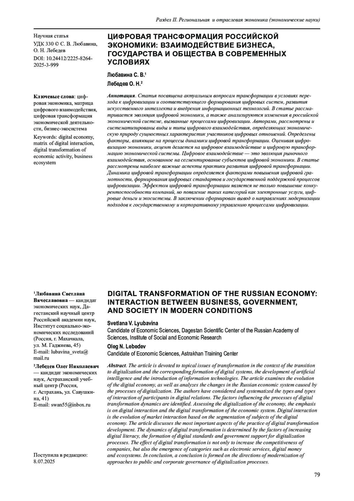 Статья: ЦИФРОВАЯ ТРАНСФОРМАЦИЯ РОССИЙСКОЙ ЭКОНОМИКИ: ВЗАИМОДЕЙСТВИЕ БИЗНЕСА, ГОСУДАРСТВА И ОБЩЕСТВА В СОВРЕМЕННЫХ УСЛОВИЯХ (2025)