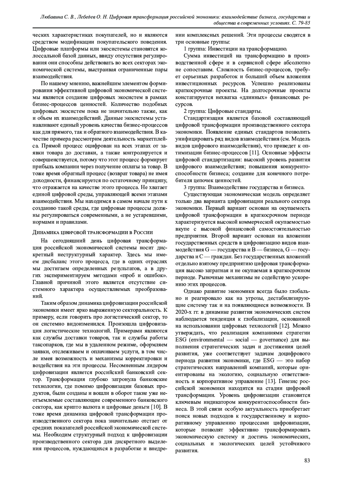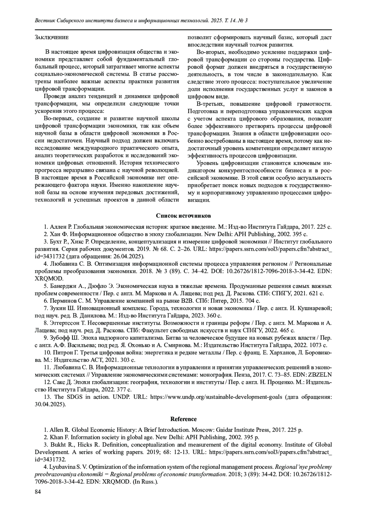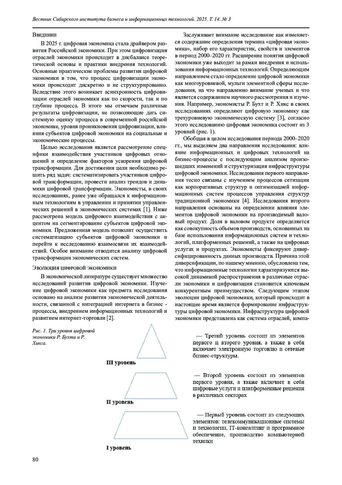 ЛЮБАВИНА С. В., ЛЕБЕДЕВ О. Н. ЦИФРОВАЯ ТРАНСФОРМАЦИЯ РОССИЙСКОЙ ЭКОНОМИКИ: ВЗАИМОДЕЙСТВИЕ БИЗНЕСА, ГОСУДАРСТВА И ОБЩЕСТВА В СОВРЕМЕННЫХ УСЛОВИЯХ // ВЕСТНИК СИБИРСКОГО ИНСТИТУТА БИЗНЕСА И ИНФОРМАЦИОННЫХ ТЕХНОЛОГИЙ. 2025. ТОМ 14, № 3