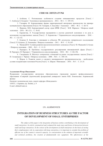 1. Агабеков, С. Региональные особенности создания инновационных продуктов [Текст] / С. Агабеков, Б. Кукурин // Экономика в промышленности. - 2012. - № 4. - С. 149-154. EDN: OXRAMX