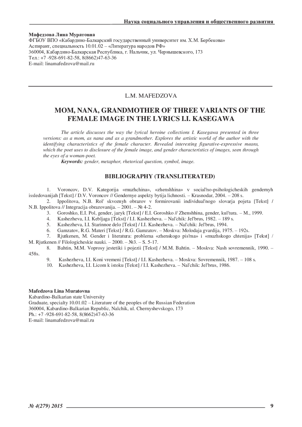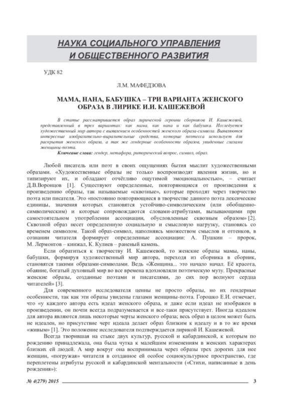 МАФЕДЗОВА Л. М. МАМА, НАНА, БАБУШКА - ТРИ ВАРИАНТА ЖЕНСКОГО ОБРАЗА В ЛИРИКЕ И. И. КАШЕЖЕВОЙ // ЭКОНОМИЧЕСКИЕ И ГУМАНИТАРНЫЕ НАУКИ. 2015. № 4 (279)