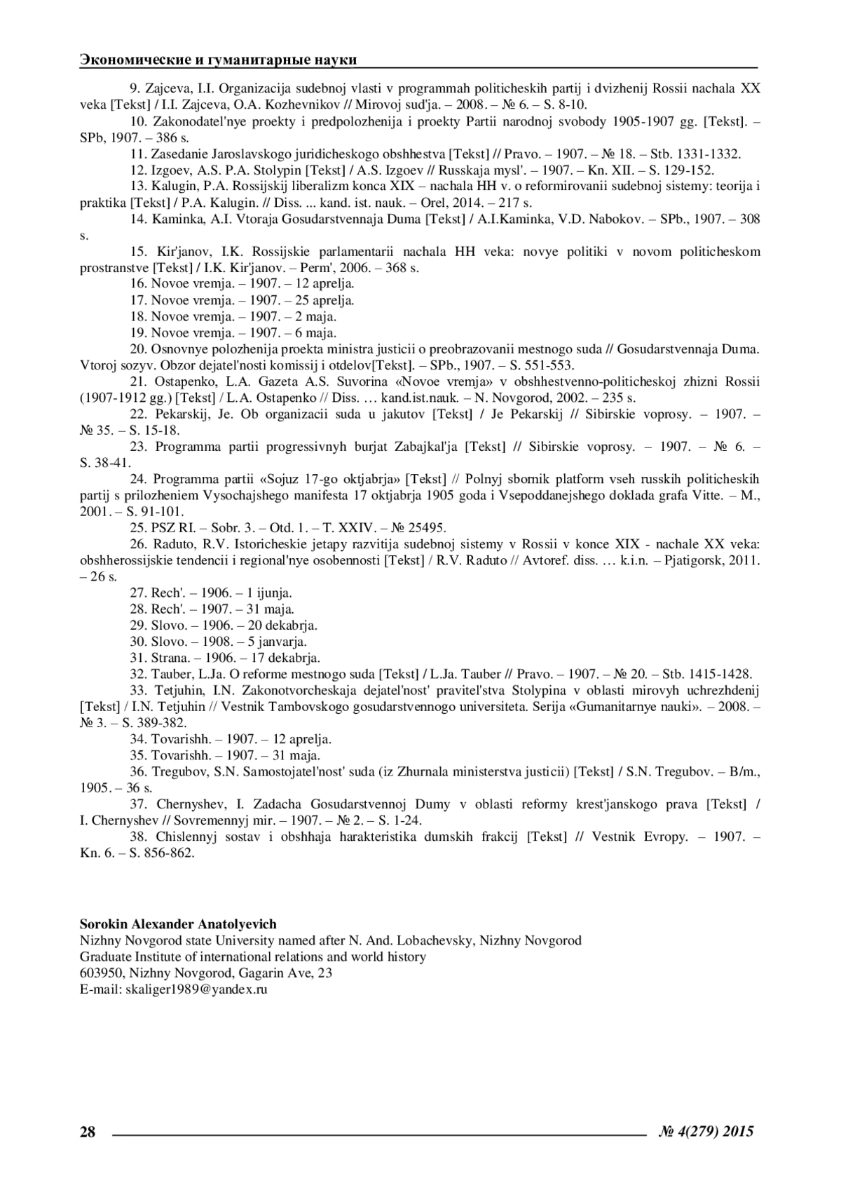 26. Радуто, Р.В. Исторические этапы развития судебной системы в России в конце XIX - начале XX века: общероссийские тенденции и региональные особенности [Текст] / Р.В. Радуто // Автореф. дисс. … к.и.н. - № 4(279) 2015 Н аука социаль ного управ ления и общес тв енного развития Пятигорск, 2011. - 26 с. EDN: QFHSZD