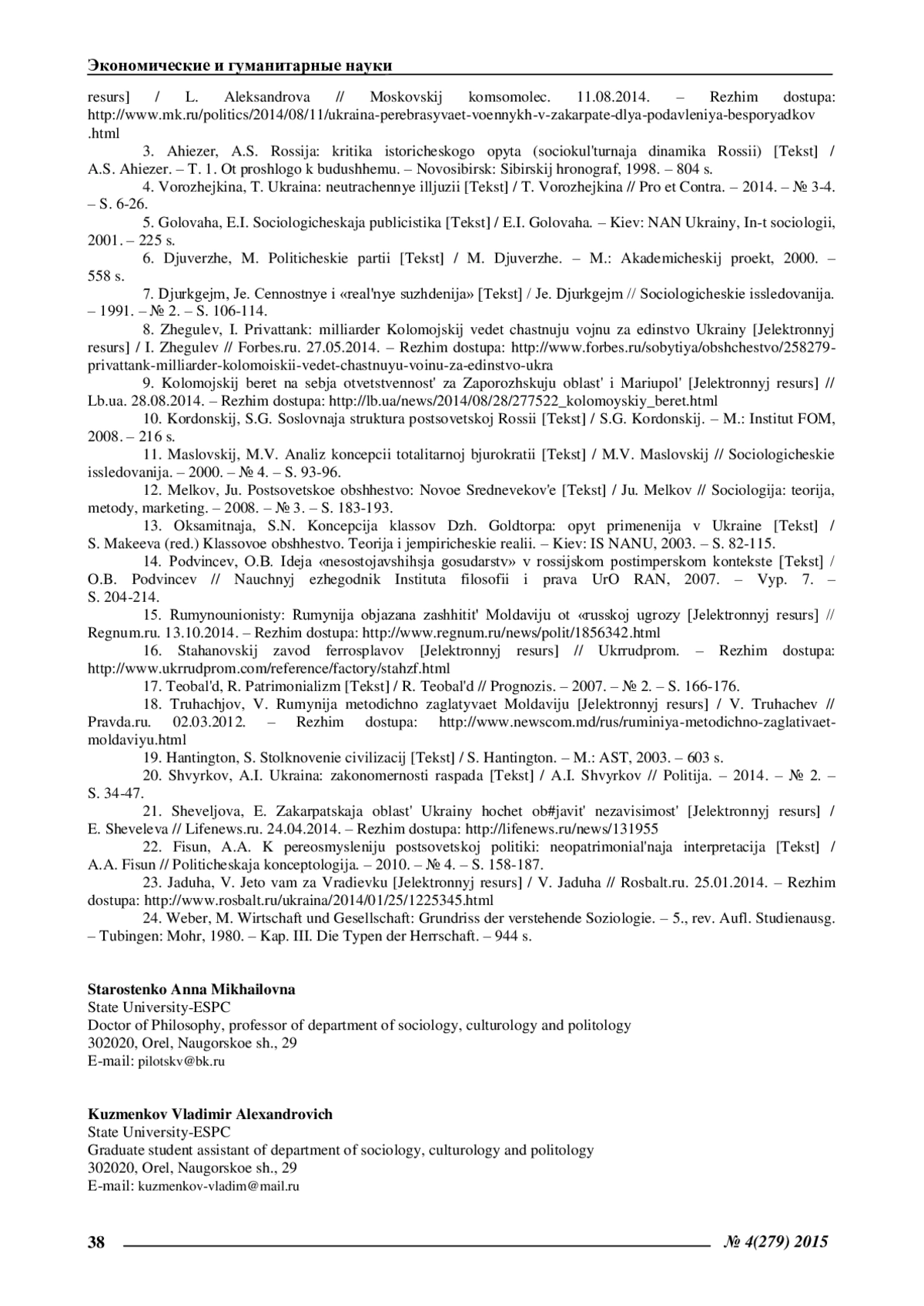 20. Швырков, А.И. Украина: закономерности распада [Текст] / А.И. Швырков // Полития. - 2014. - № 2. - С. 34-47. EDN: VBVVAP