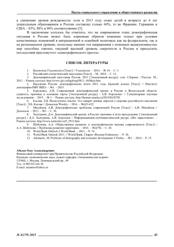 4. Население России: демографические итоги 2013 года. Краткий доклад [Текст] // Институт демографии НИУ ВШЭ. - №1. - 2015.