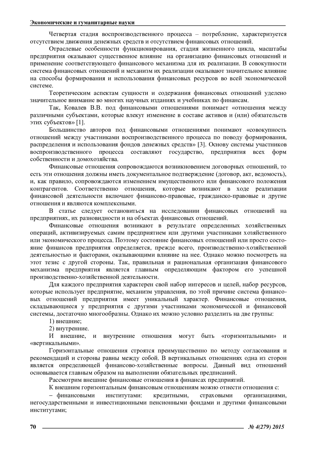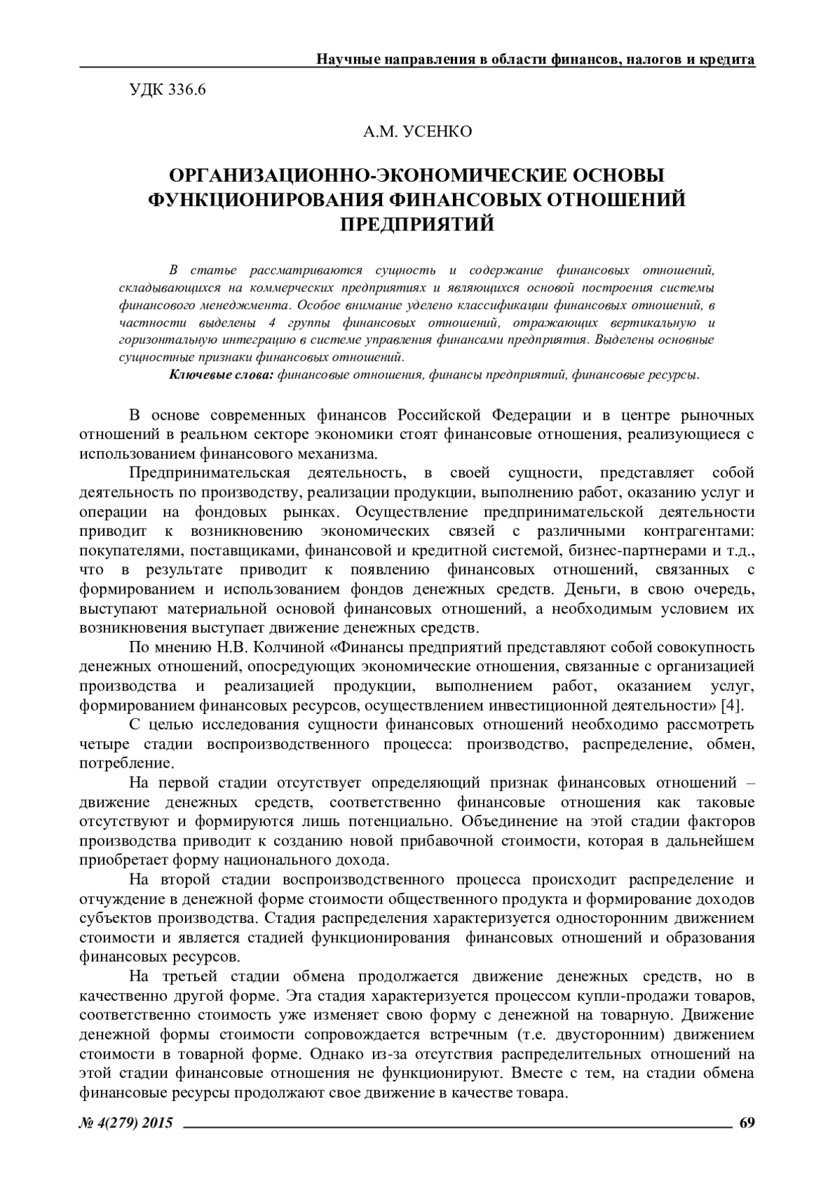 В статье рассматриваются сущность и содержание финансовых отношений, складывающихся на коммерческих предприятиях и являющихся основой построения системы финансового менеджмента. Особое внимание уделено классификации финансовых отношений, в частности выделены 4 группы финансовых отношений, отражающих вертикальную и горизонтальную интеграцию в системе управления финансами предприятия. Выделены основные сущностные признаки финансовых отношений