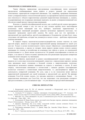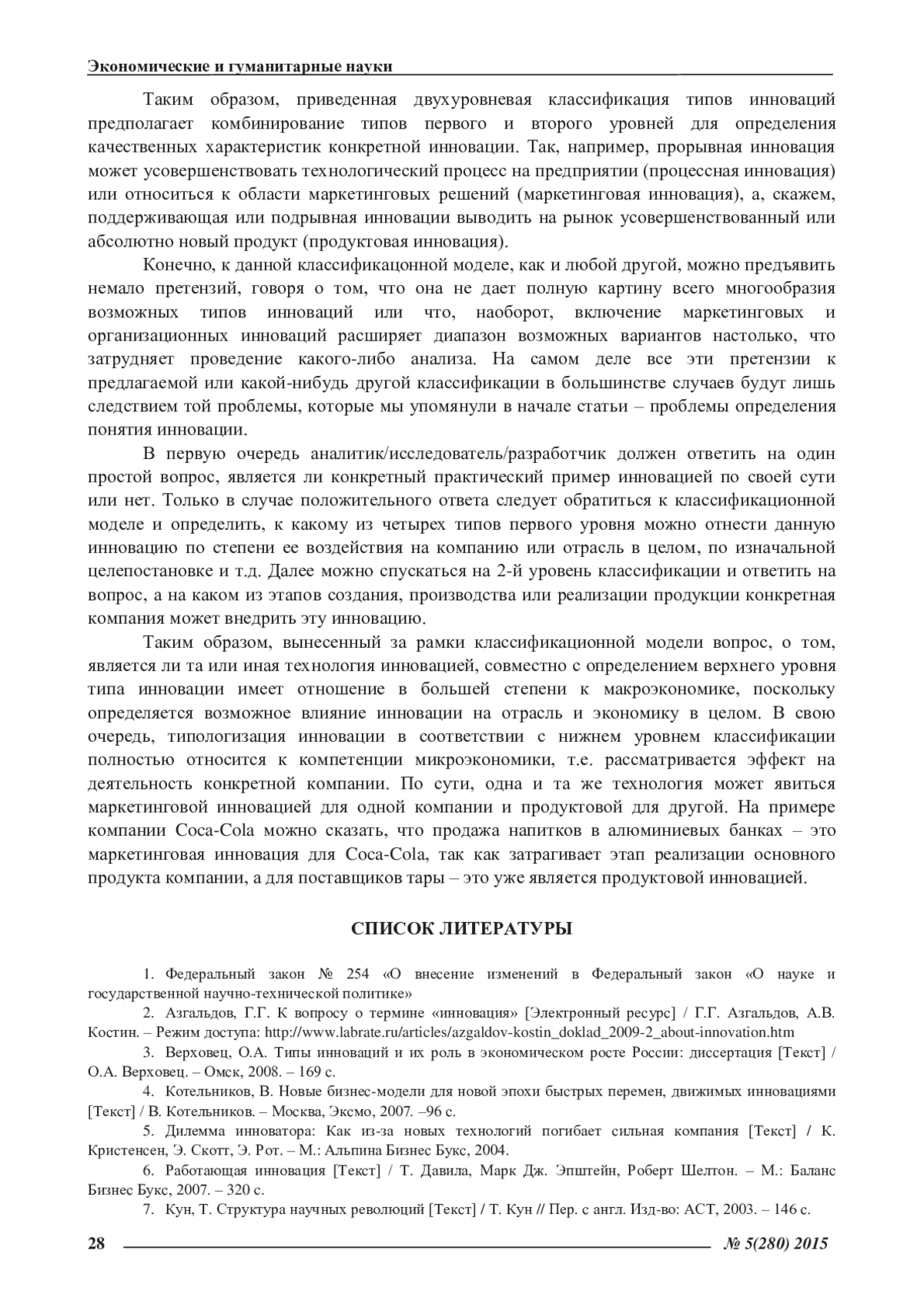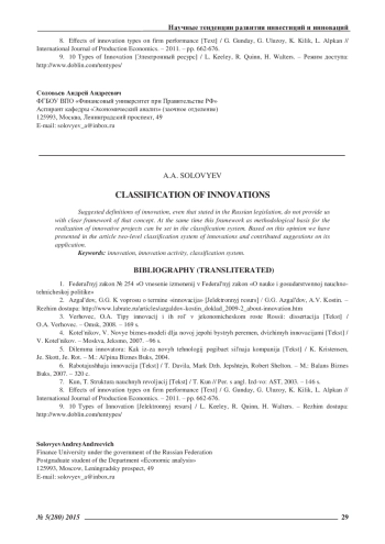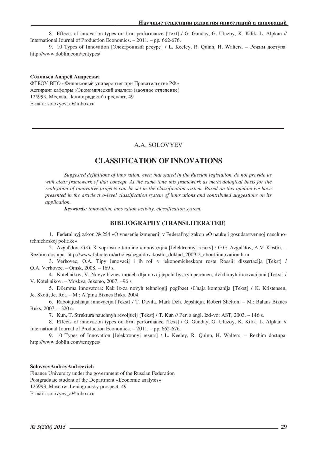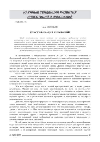СОЛОВЬЕВ А. А. КЛАССИФИКАЦИЯ ИННОВАЦИЙ // ЭКОНОМИЧЕСКИЕ И ГУМАНИТАРНЫЕ НАУКИ. 2015. № 5 (280)