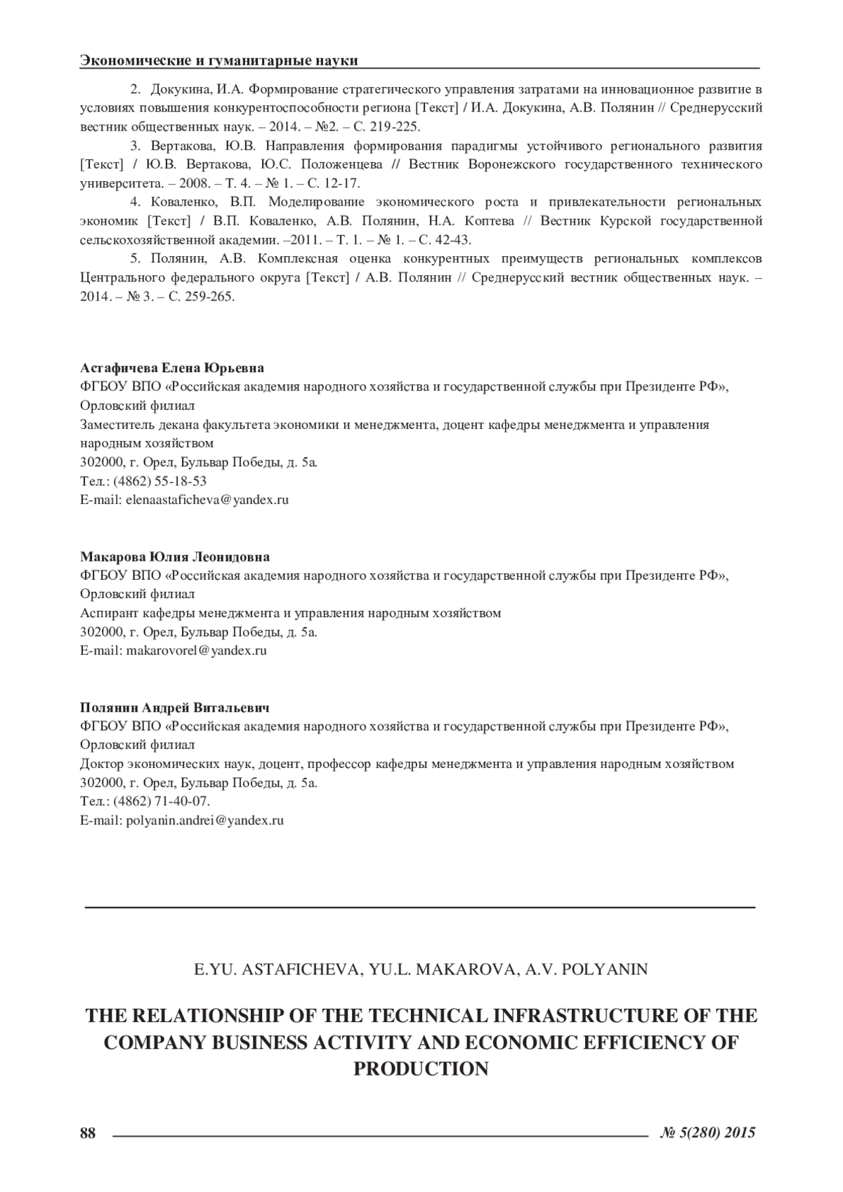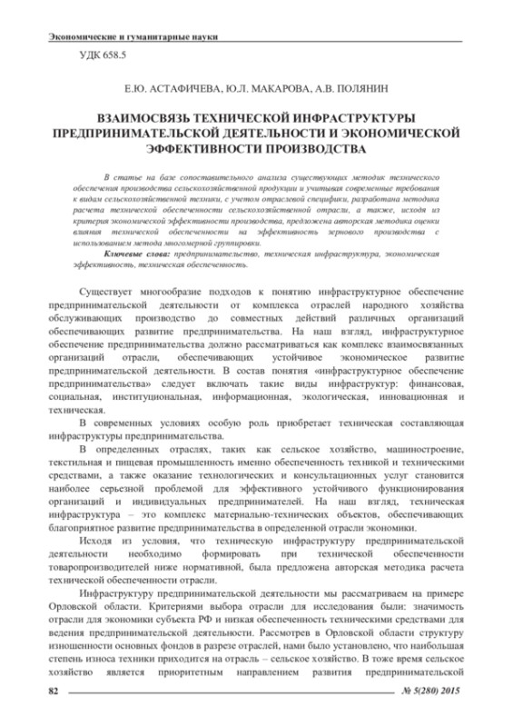 АСТАФИЧЕВА Е. Ю., МАКАРОВА Ю. Л., ПОЛЯНИН А. В. ВЗАИМОСВЯЗЬ ТЕХНИЧЕСКОЙ ИНФРАСТРУКТУРЫ ПРЕДПРИНИМАТЕЛЬСКОЙ ДЕЯТЕЛЬНОСТИ И ЭКОНОМИЧЕСКОЙ ЭФФЕКТИВНОСТИ ПРОИЗВОДСТВА // ЭКОНОМИЧЕСКИЕ И ГУМАНИТАРНЫЕ НАУКИ. 2015. № 5 (280)