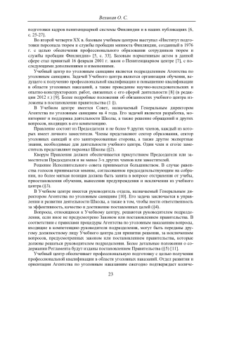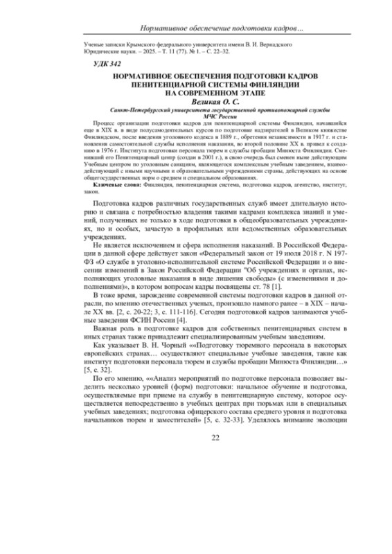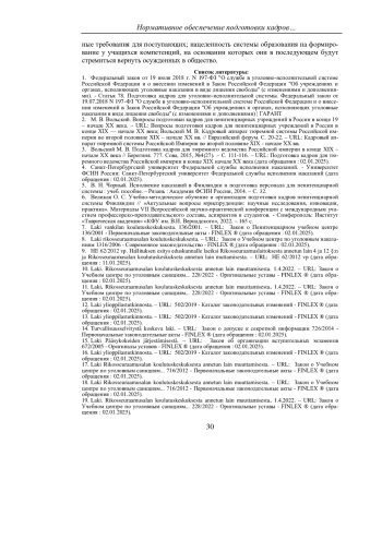 6. Великая О. С. Учебно-методическое обучение и организация подготовки кадров пенитенциарной системы Финляндии // “Актуальные вопросы юриспруденции: научные исследования, инновации, практика”. Материалы VII Всероссийской научно-практической конференции c международным участием профессорско-преподавательского состава, аспирантов и студентов. - Симферополь: Институт “Таврическая академия” “КФУ им. В.И. Вернадского”, 2022. - 165 с. EDN: VAWRIC