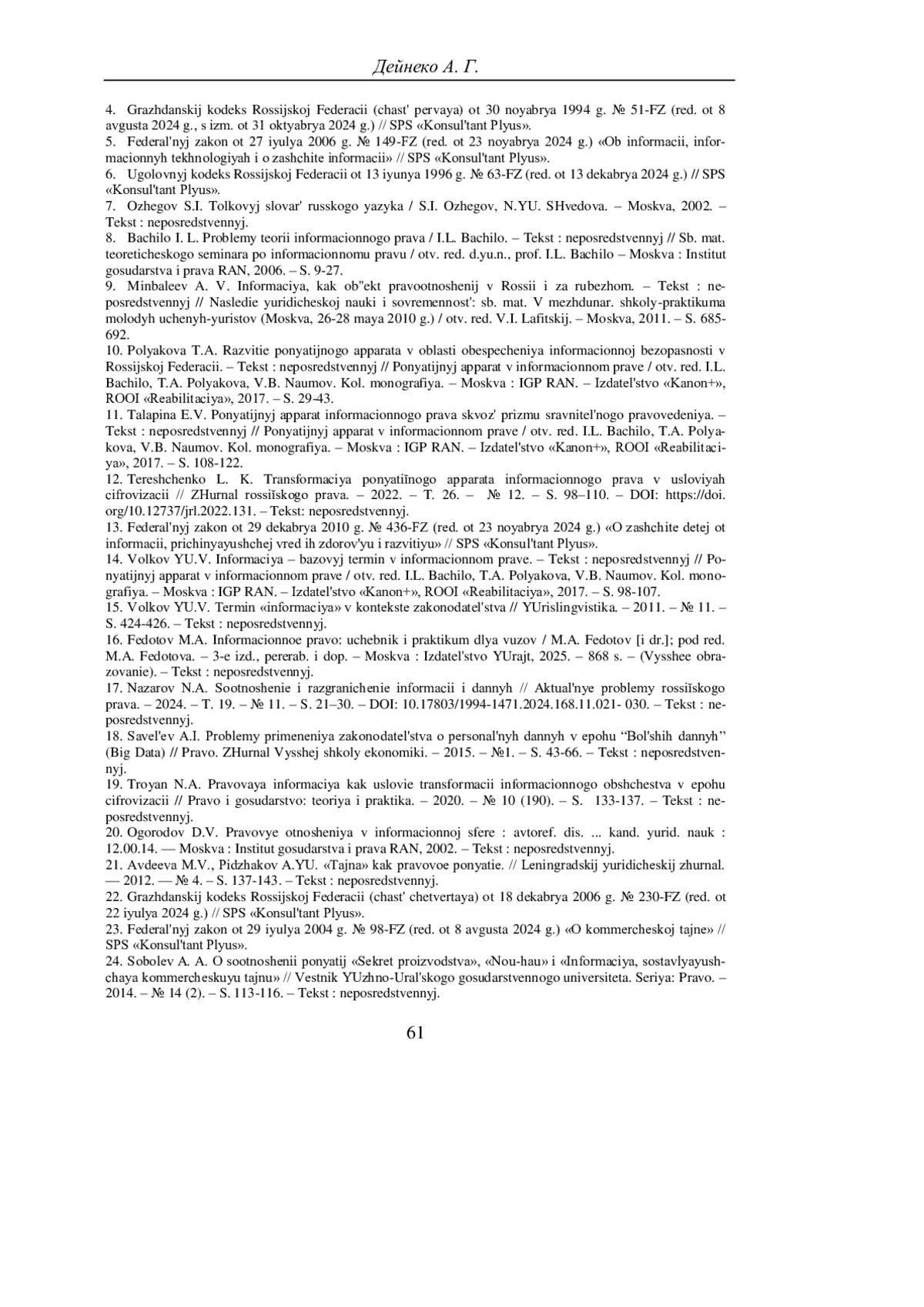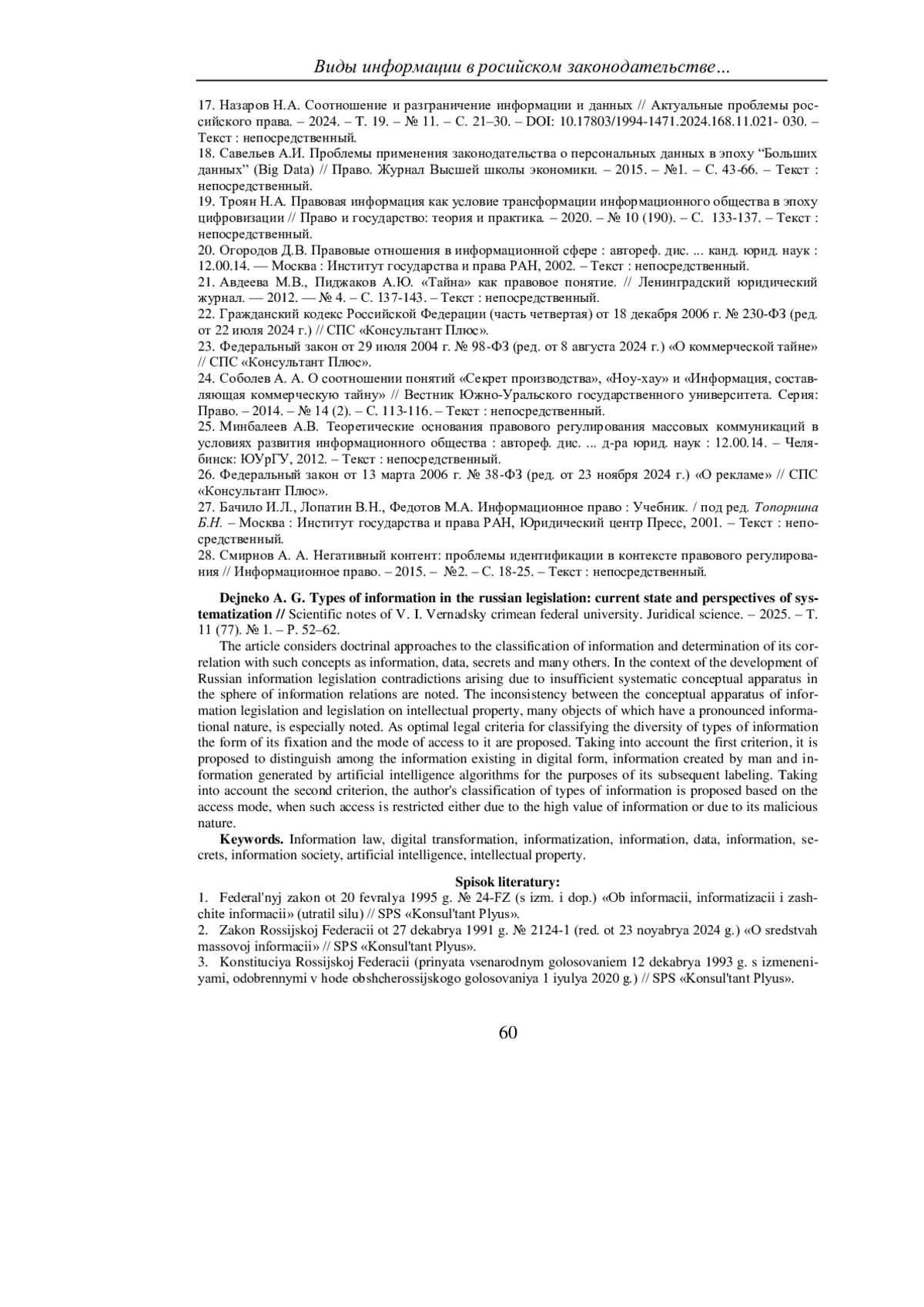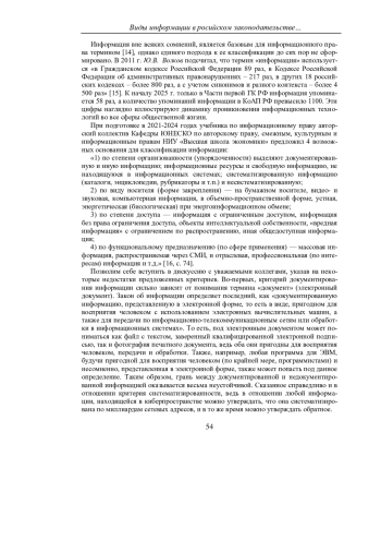 17. Назаров Н.А. Соотношение и разграничение информации и данных // Актуальные проблемы российского права. - 2024. - T. 19. - № 11. - С. 21-30. - 10.17803/1994-1471.2024.168.11.021- 030. -Текст: непосредственный. DOI: 10.17803/1994-1471.2024.168.11.021-030.- EDN: IMRNQA