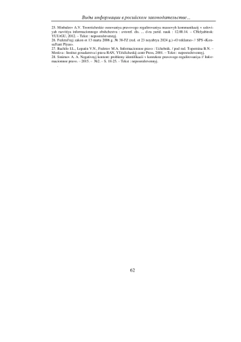 25. Минбалеев А.В. Теоретические основания правового регулирования массовых коммуникаций в условиях развития информационного общества: автореф. дис.. д-ра юрид. наук: 12.00.14. - Челябинск: ЮУрГУ, 2012. - Текст: непосредственный. EDN: QSPNDJ