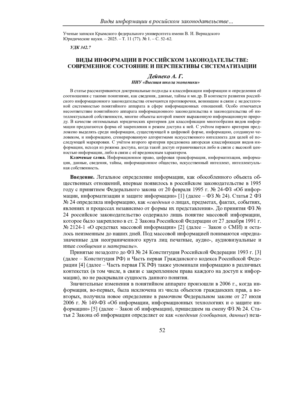 В статье рассматриваются доктринальные подходы к классификации информации и определения её соотношения с такими понятиями, как сведения, данные, тайны и мн. др. В контексте развития российского информационного законодательства отмечаются противоречия, возникшие в связи с недостаточной системностью понятийного аппарата в сфере информационных отношений. Особо отмечается несоответствие понятийного аппарата информационного законодательства и законодательства об интеллектуальной собственности, многие объекты которой имеют выраженную информационную природу. В качестве оптимальных юридических критериев для классификации многообразия видов информации предлагаются форма её закрепления и режим доступа к ней. С учётом первого критерия предложено выделять среди информации, существующей в цифровой форме, информацию, созданную человеком, и информацию, сгенерированную алгоритмами искусственного интеллекта для целей её последующей маркировки. С учётом второго критерия предложена авторская классификация видов информации, исходя из режима доступа, когда такой доступ ограничивается либо в связи с высокой ценностью информации, либо в связи с её вредоносным характером.