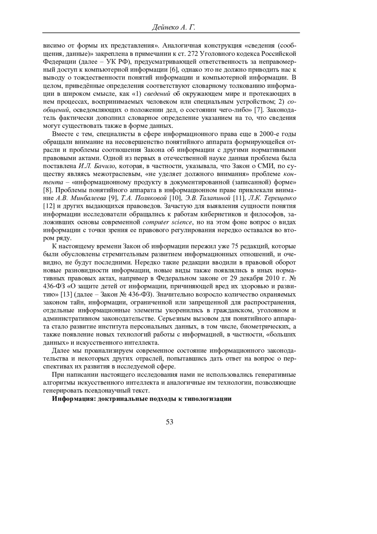 12. Терещенко Л. К. Трансформация понятийного аппарата информационного права в условиях цифровизации // Журнал российского права. - 2022. - Т. 26. - № 12. - С. 98-110. - 10.12737/jrl.2022.131. - Текст: непосредственный. DOI: 10.12737/jrl.2022.131.- EDN: VFBVRF